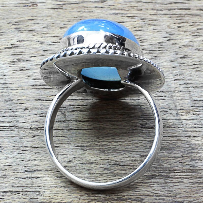Backed by our Happiness GuaranteeThis stunning sterling silver and blue chalcedony cocktail ring is presented by Alok Jain, an Indian artisan who grew up immersed in the world of hand-crafted items. A single blue chalcedony stone is encircled by intricate oxidized sterling silver crafted into a rope design. Traditionally, blue chalcedony is thought to promote goodwill and to enhance group stability.