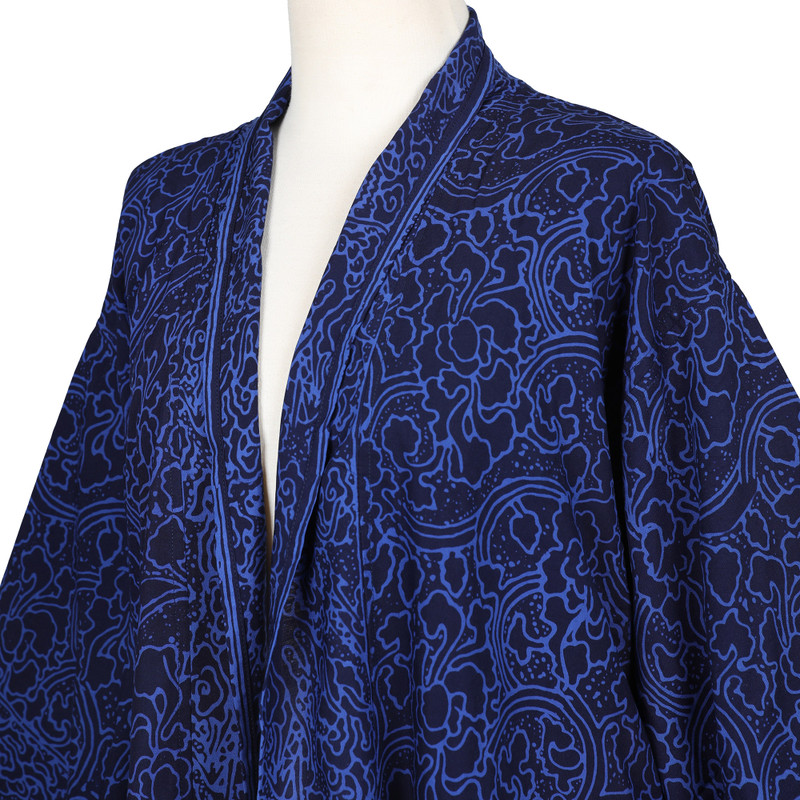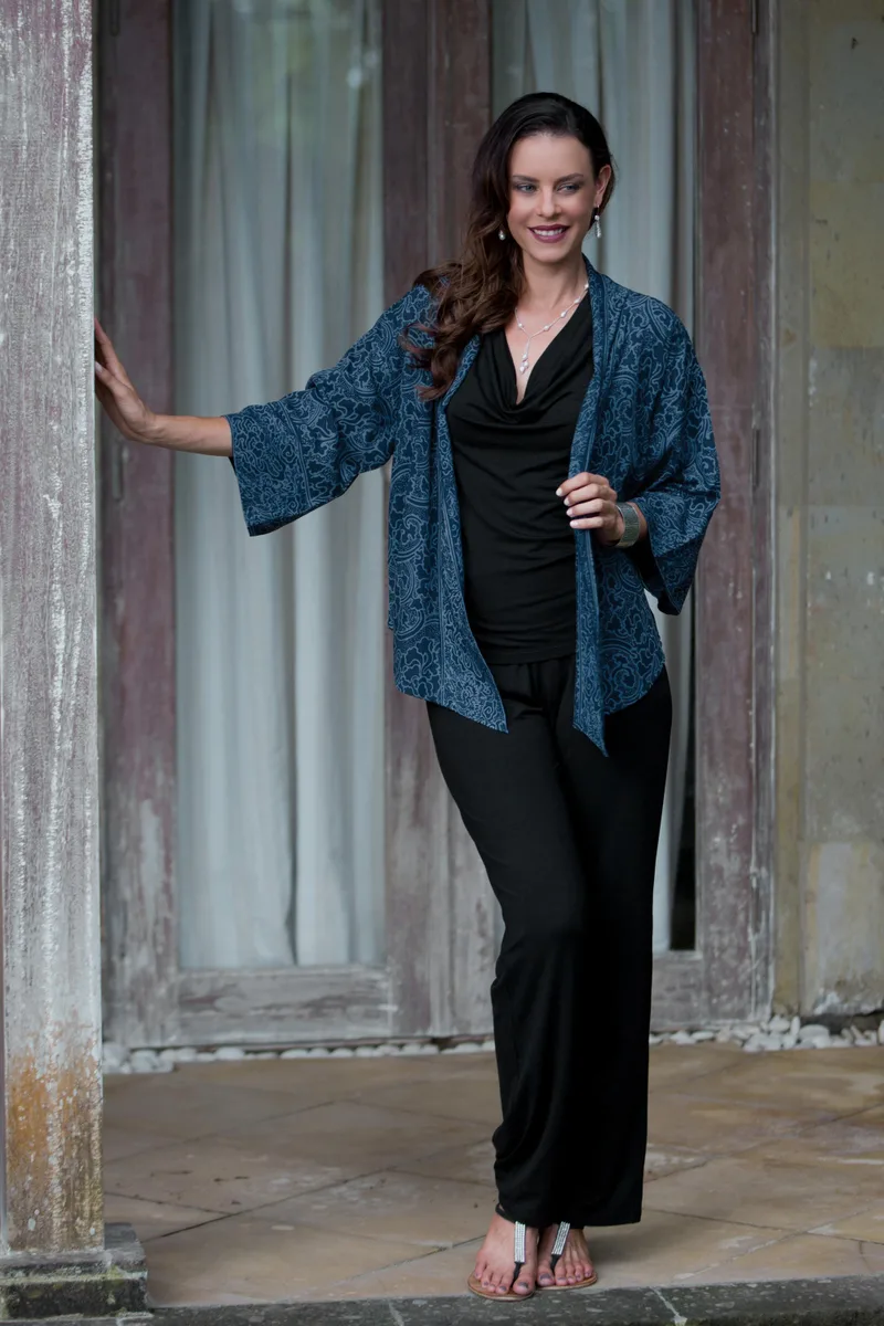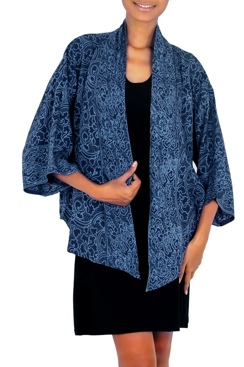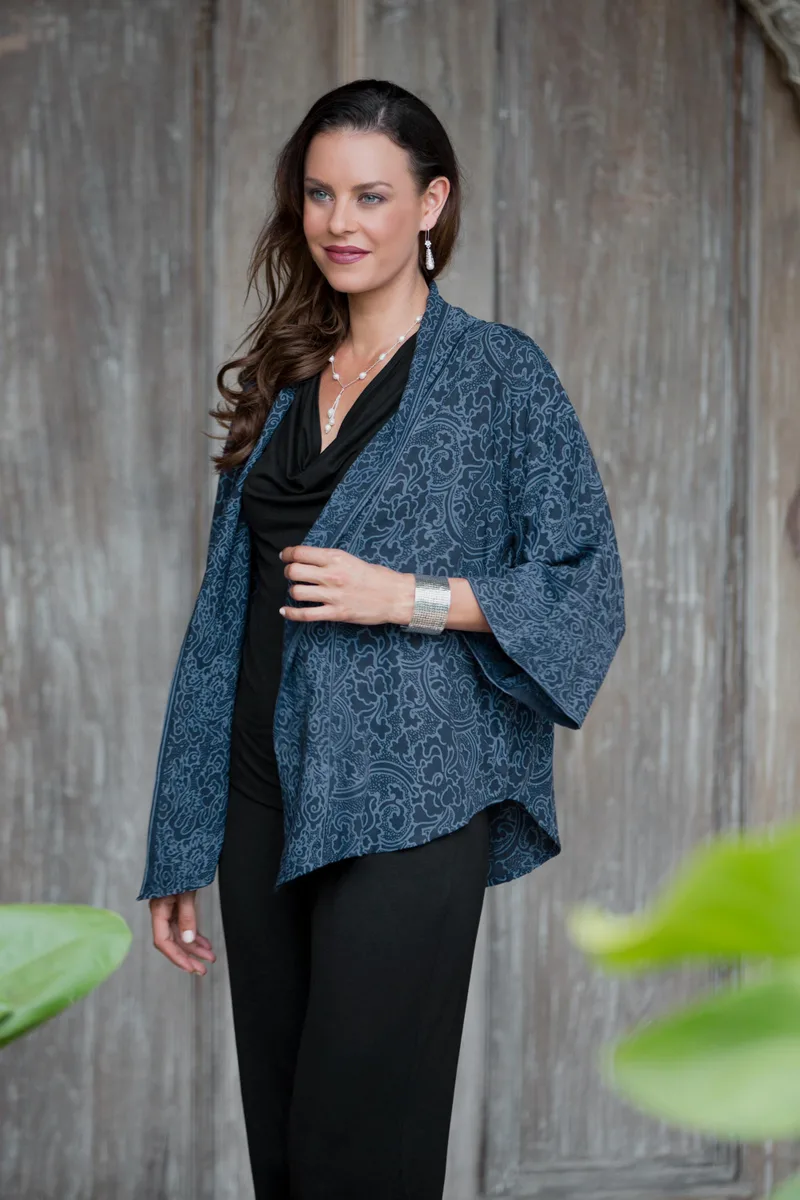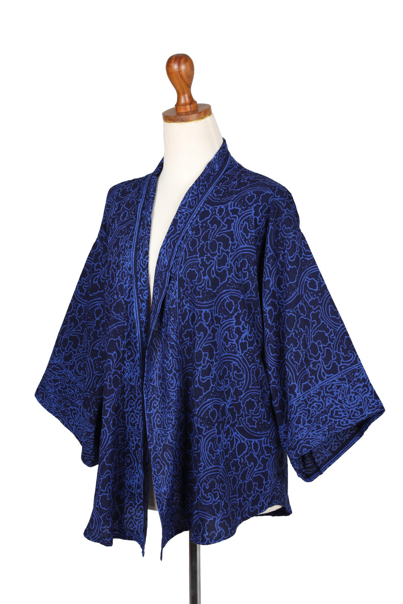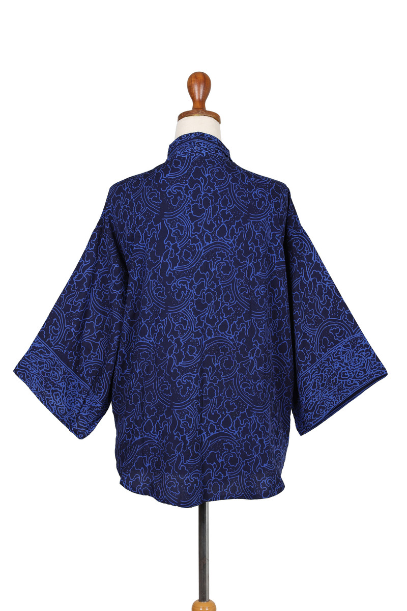 An original design by Saktut Raitawati, this beautiful jacket showcases Java's classic batik motifs. The artisan selects blue flowers in a field of purple for the open front jacket. The batik motifs are created with the silk screen technique.