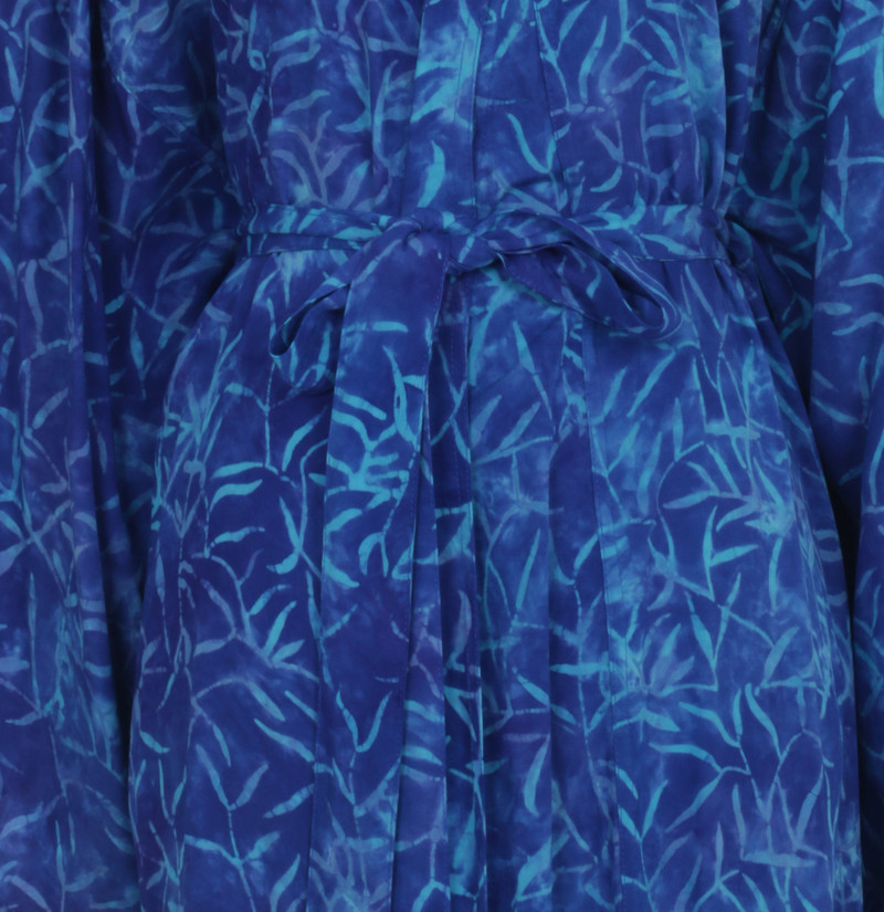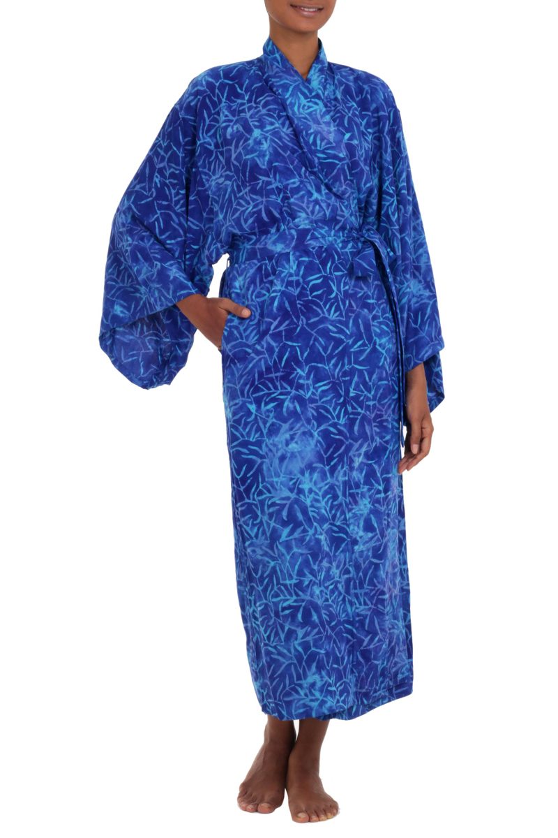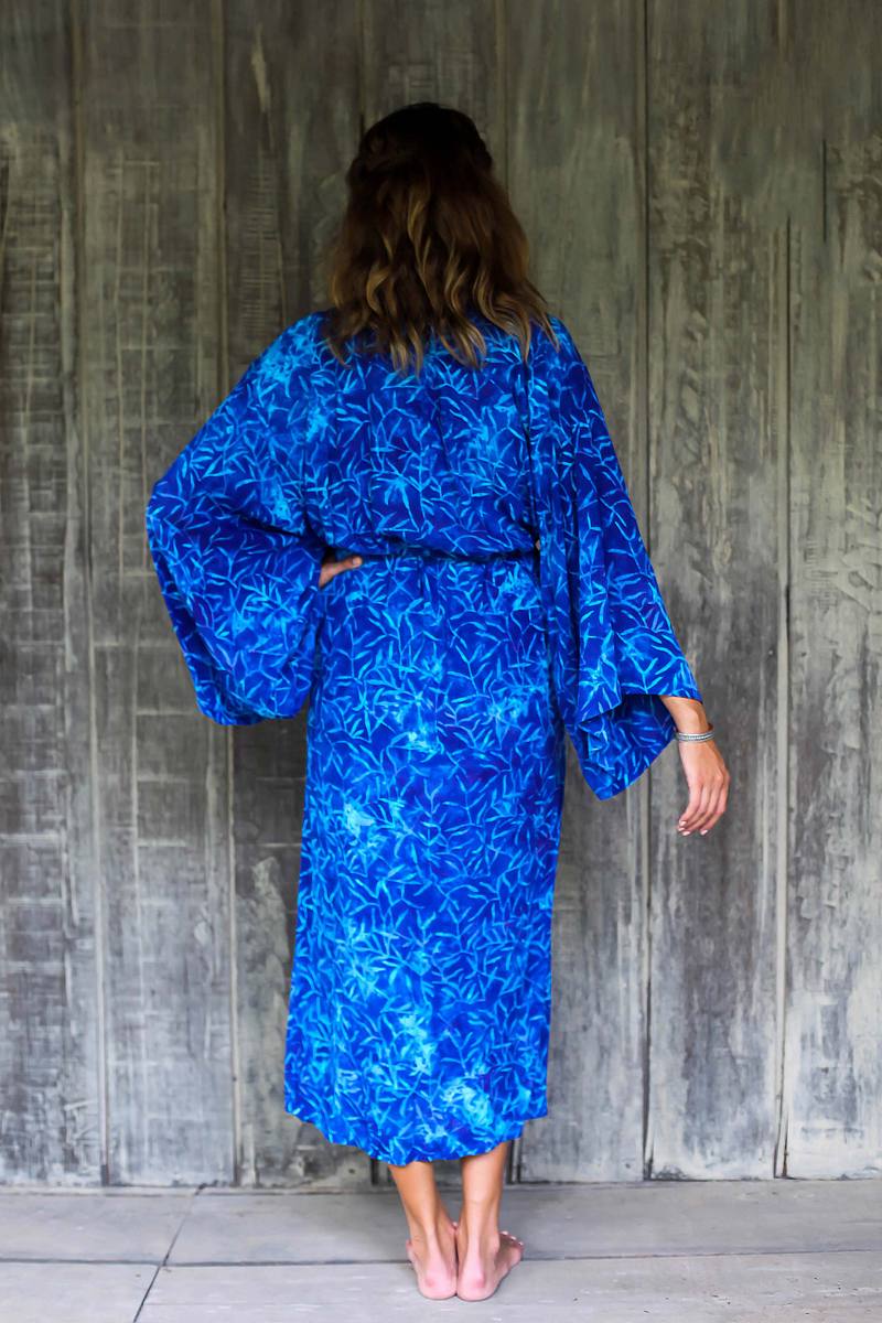 Cerulean bamboo leaves sway and dance over the royal blue rayon textures of this stylish robe from Indonesia. Perfect to lounge in for those lovely stress-free moments, the long-sleeve robe is crafted with traditional Balinese tie-dye and batik techniques. Side-seam pockets and a self-tie belt complete the robe's design.