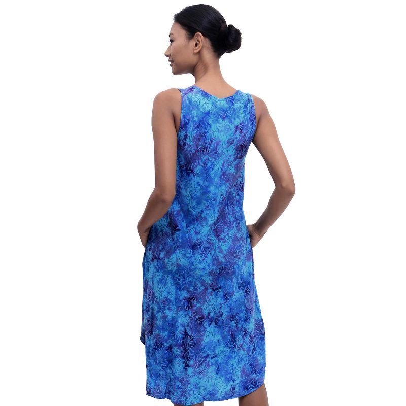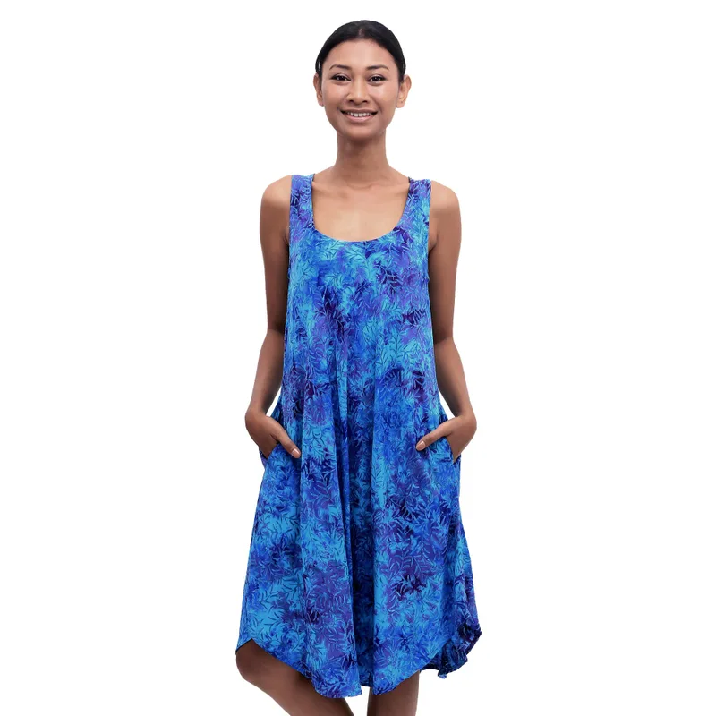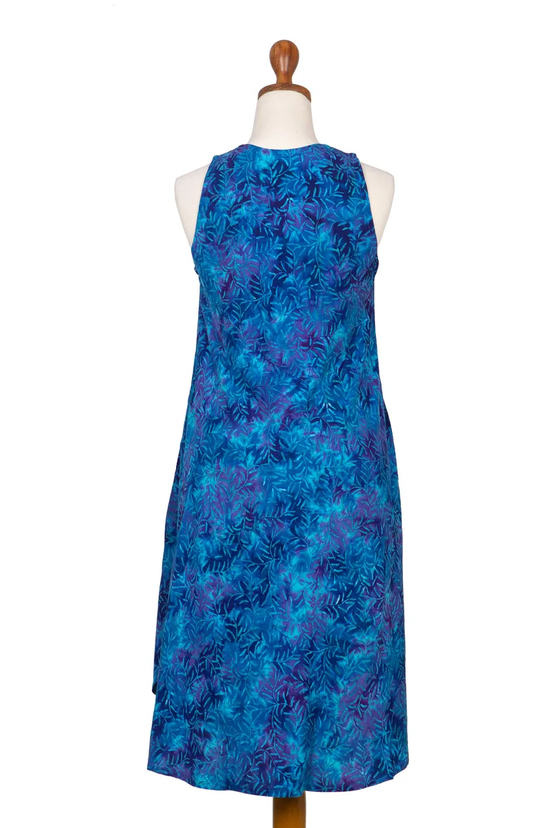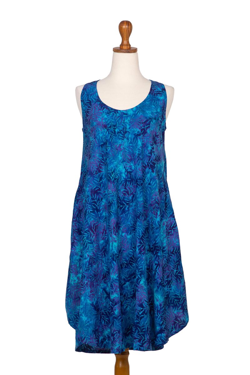 Backed by our 100% Happiness GuaranteeTextile artisan Desak Nyoman Parwati creates a casual dress replete with natural Balinese elements. Leafy motifs are created through a traditional batik dying process, which involves an artistic application of wax along with the tie-dying technique to create complex layers of color. Vibrant indigo and cerulean evoke a seaside feel.