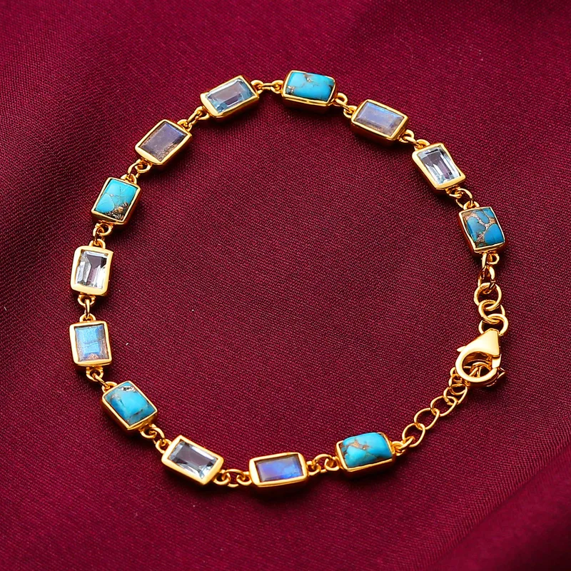 Fragments of celestial light come alive in this breathtaking bracelet, crafted in India by designerNeetu Barathi. Radiant 18k gold-plated sterling silver links cradle a dazzling trio of reconstituted turquoise, labradorite, and blue topaz, echoing the beauty of sky and sea in a celebration of nature's splendor.