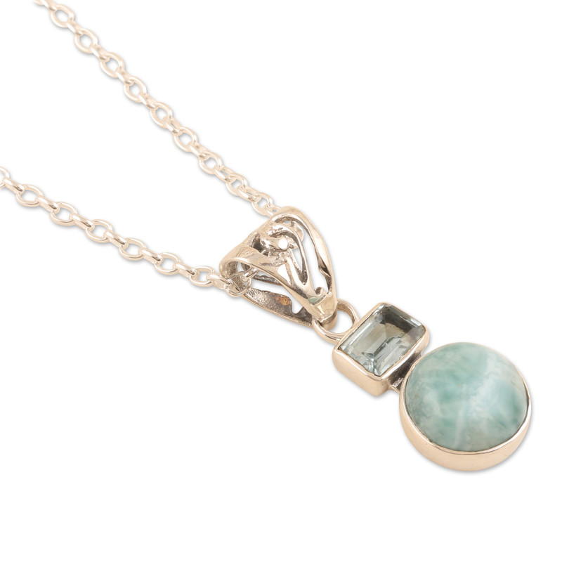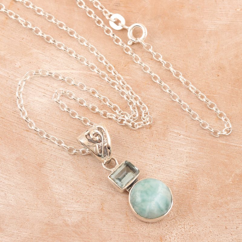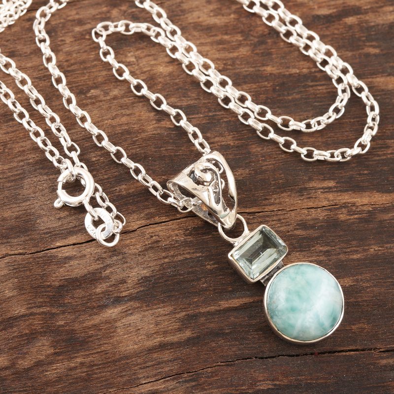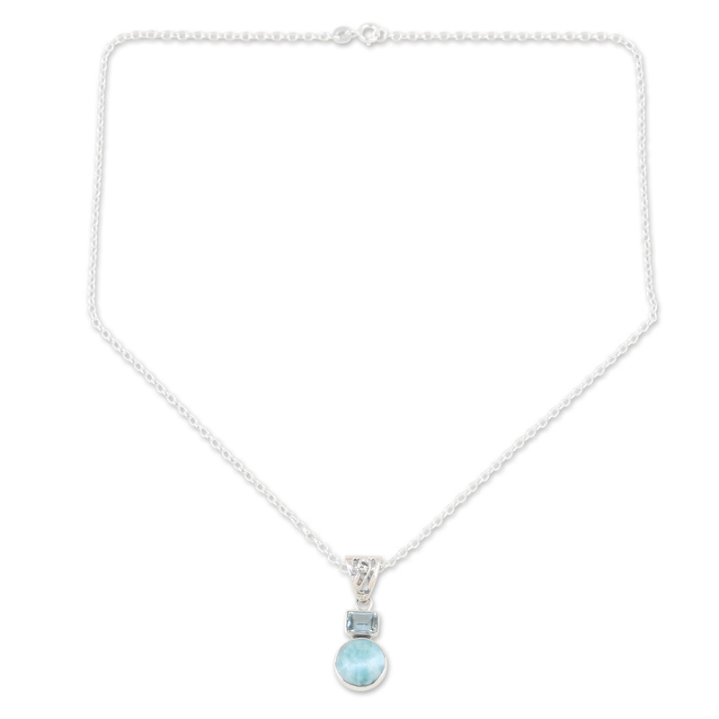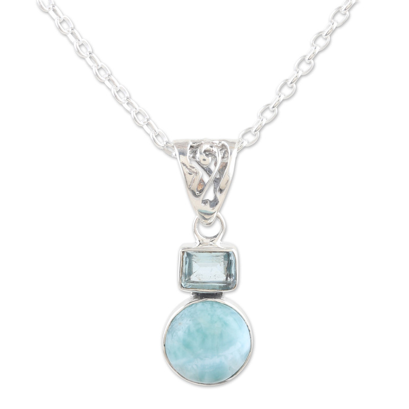 India's high-quality craftsmanship creates a stunning accessory with a serene aura, making it the perfect complement to any outfit. Presented by Shanker, this sterling silver pendant necklace is embellished with a combination finish for a glamorous look. The centerpieces are a one-carat faceted blue topaz stone and a larimar cabochon, symbolizing peace and health.