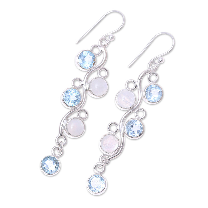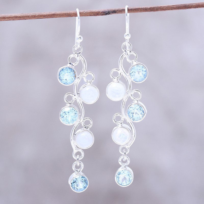 Resembling a floral vine that greets you in the morning, these dangle earrings are presented by India's Neeru Goel. Local artisans craft the earrings of sterling silver with a high-polish finish, featuring gems of rainbow moonstone and five carats of sparkling blue topaz that dangle from the central vine.