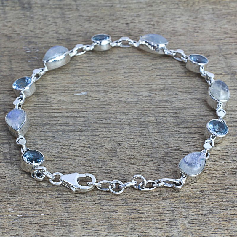 This dreamy link bracelet is presented by Indian artisan Shanker. It features four carats of pear-shaped blue topaz gemstones and natural rainbow moonstone cabochons connected by high-polish sterling silver links. Traditionally, blue topaz is thought to bring truth and wisdom, while rainbow moonstone intensifies feminine goddess energy.
