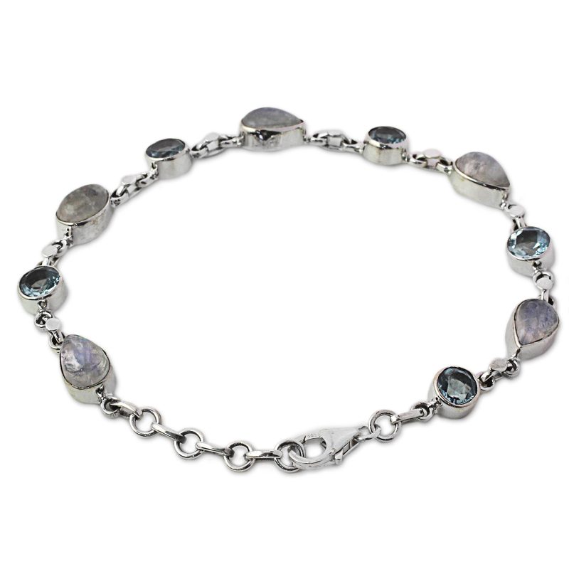 You can find our rainbow moonstone and blue topaz link bracelet 'Misty Sky' by Shanker in jewelry categories such as Gemstone Bracelets, Birthstone Bracelets, Blue Topaz Bracelets, Rainbow Moonstone Bracelets and Silver Bracelets. Enjoy exploring these sections for other Novica treasures.