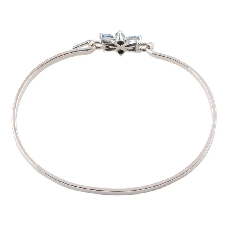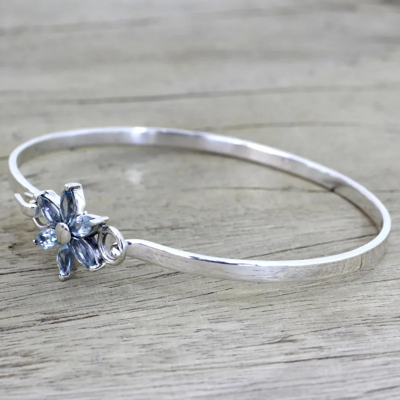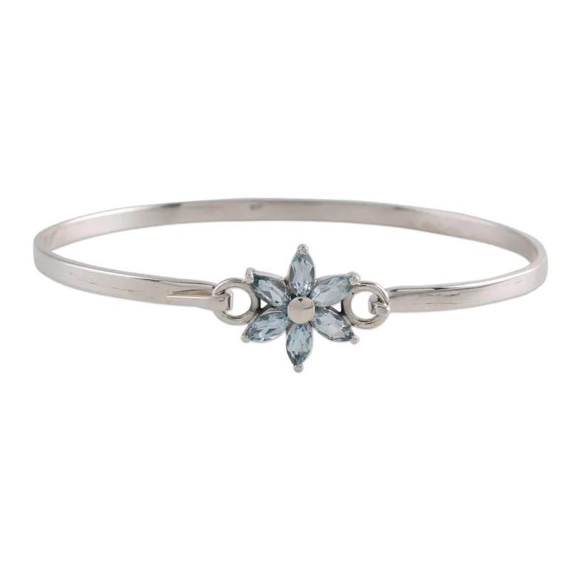 A dainty flower is formed by green marquise blue topaz stones totaling over one carat. The blossom centers a band of sterling silver for an elegant pendant bracelet. From Shanker, this delightful design is crafted by hand in India.