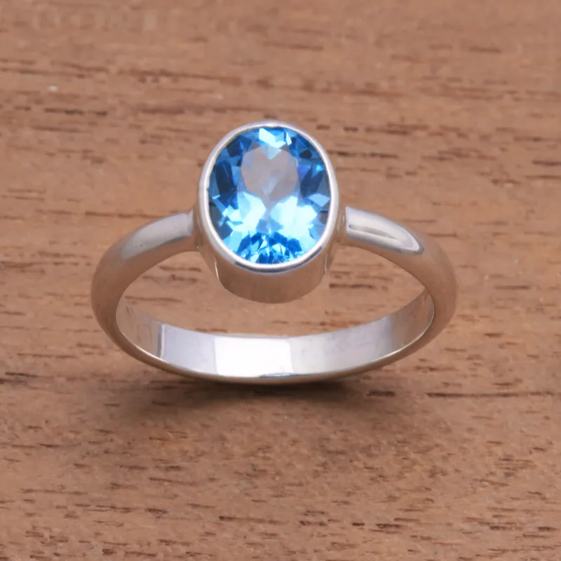 Balinese artisans select blue topaz, gem of empathy and truth, to crown the minimalist design of this ring for the Mutiara Collection. The sky blue glow of the two-carat gem is a harmonious complement to the cool sheen of sterling silver in this handcrafted ring.
