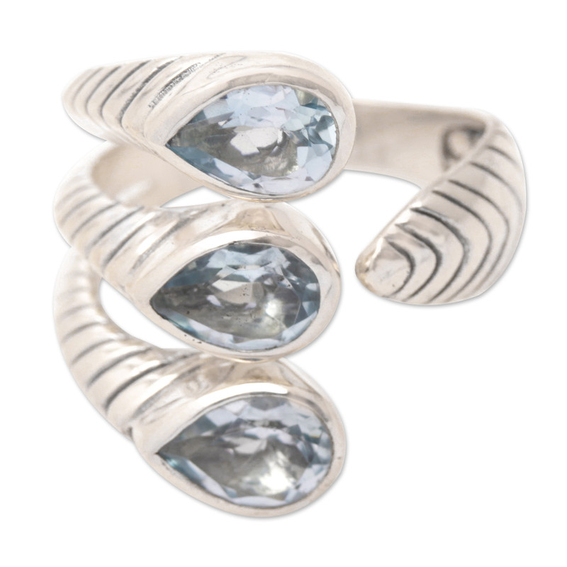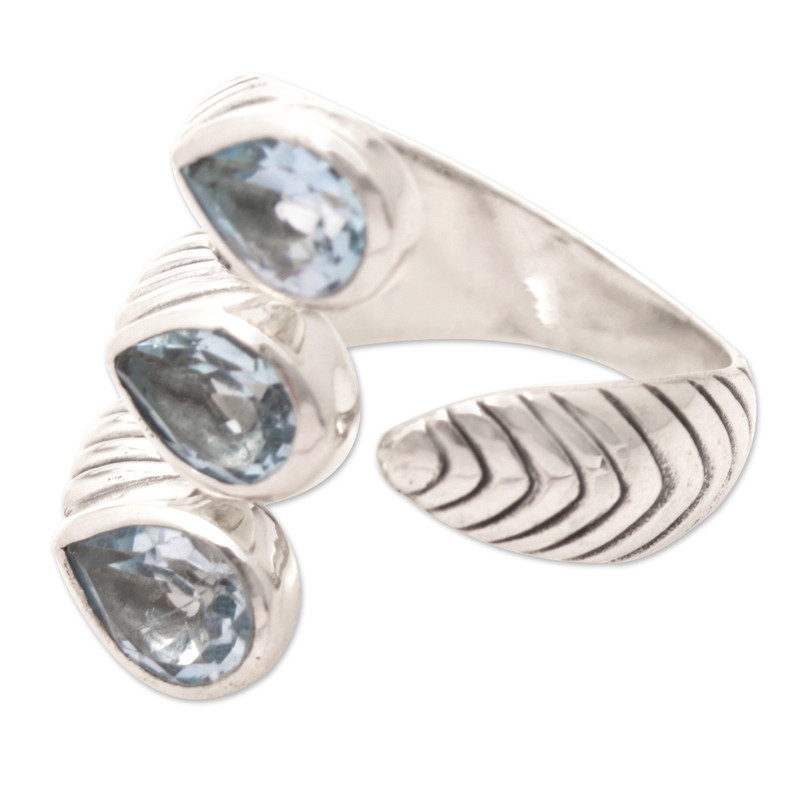 Backed by our 100% Happiness GuaranteeWorking with traditional Balinese silversmith techniques, artisan Asri Paramita creates a breathtaking wrap ring that dazzles with three stunning teardrop blue topaz gemstones. The ring is crafted from sterling silver with a combination of oxidized and polished finishes.