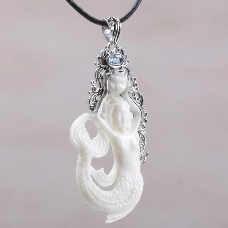A beautiful mermaid holds a flower over her head, hanging from a length of leather cord. Made Wardika crafts this elegant pendant necklace, carving the mermaid from bone with a natural white finish. He accents the mermaid with spiraling motifs of sterling silver, fitted with a petite stone of blue topaz.