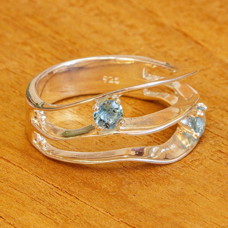 Backed by our 100% Happiness GuaranteeThis elegant ring is the perfect accessory for summer afternoons out in the sun. Ezequiel Tapia handcrafts its beautifully intertwined ribbons of 925 sterling silver finishes them with two blue topaz gemstones.