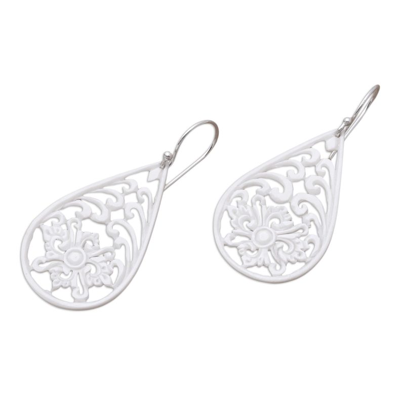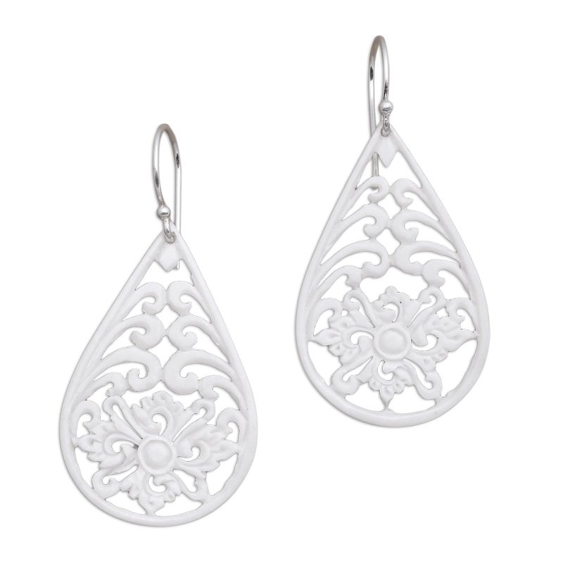 Showcasing the pride of Bali, these dangle earrings are created by Ayu Ary. She works with bone, diligently hand-carving spiraling openwork and floral patterns in their drop-like shapes. Each earring swings from a hook of sterling silver.