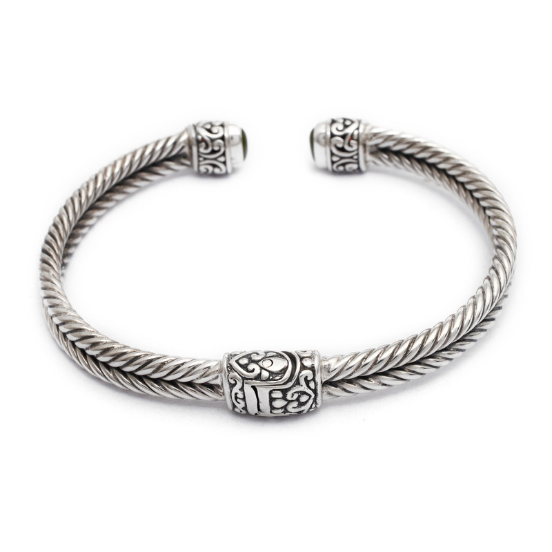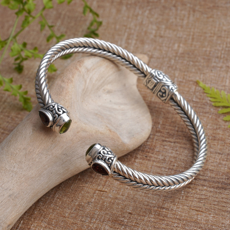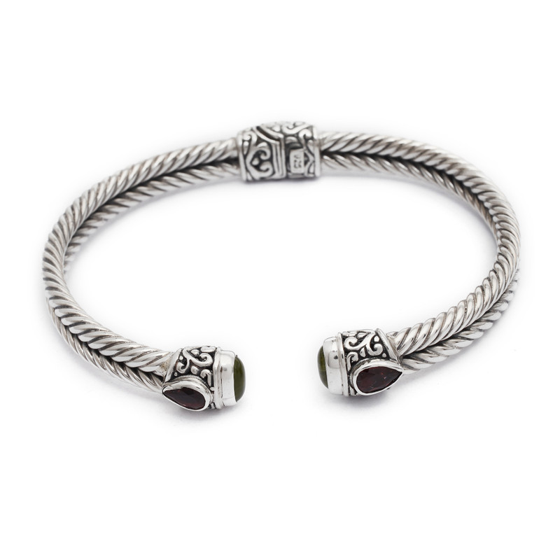 Garnet buds and the fresh green of peridot grace the ends of this cuff bracelet from Bali's Wayan Neri. The braided cuff is crafted by hand of sterling silver and features a concealed hinge for comfort. The artisan adds traditional Balinese details to complete the design.