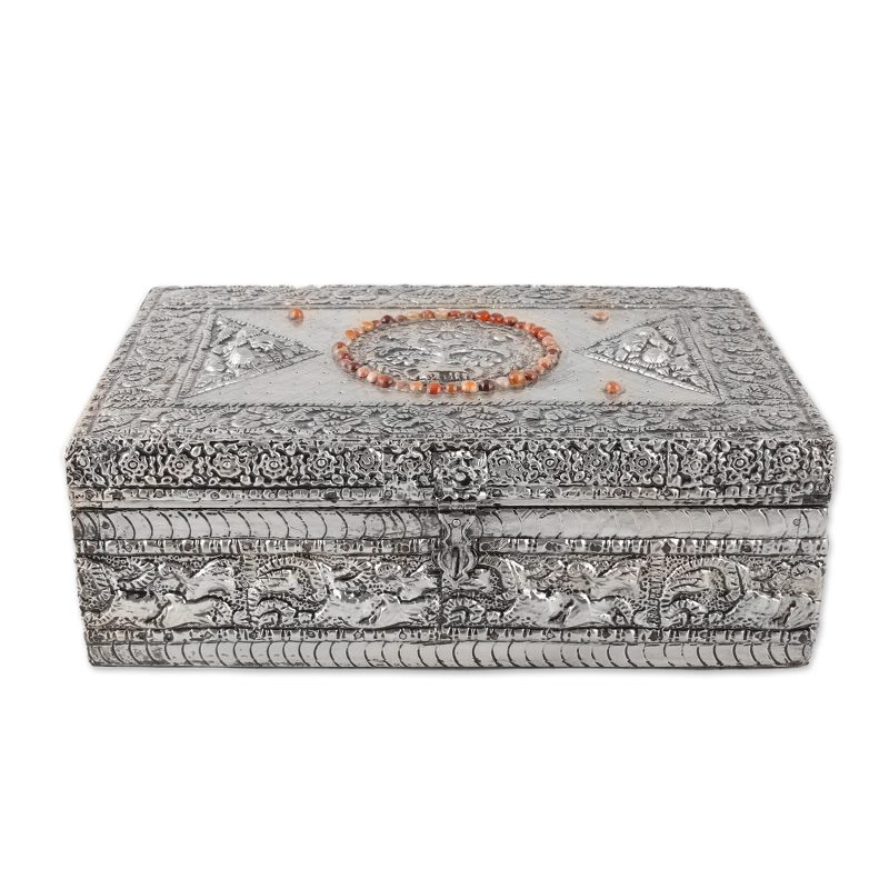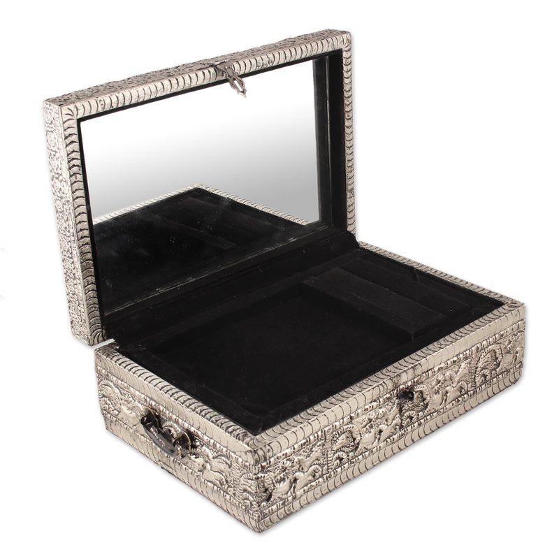 Backed by our 100% Happiness GuaranteeBeautifully depicted in gleaming repoussé, floral lace covers an opulent jewelry box. Khalid Ali crafts the box of mango wood, covered in brass repoussé bathed in nickel. He lines the box with velvet and adds a lift out tray. The piece features ornate handles, a mirror inside the lid, and a latch that can be locked. Brightly colored stones complete the design with sunny elegance.
