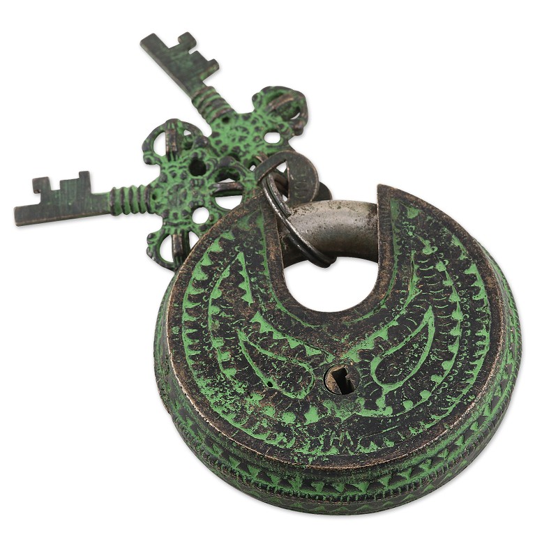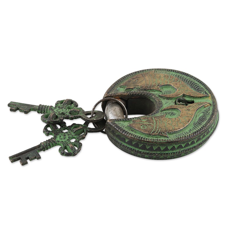 Designed to resemble a royal fish pond, Khalid Ali's lock and ket set is both fully functioning and patently unique as a home accent. Accompanied with a spare key, the brass set is crafted by Indian artisans, who cast the fish pond with fine detailing.