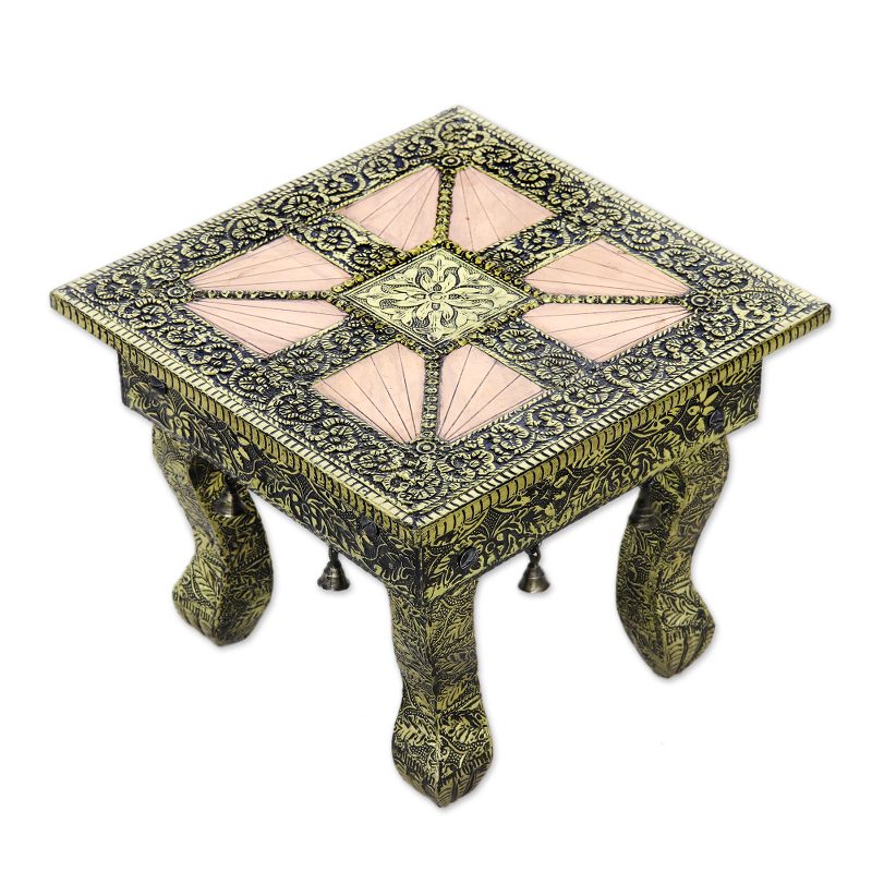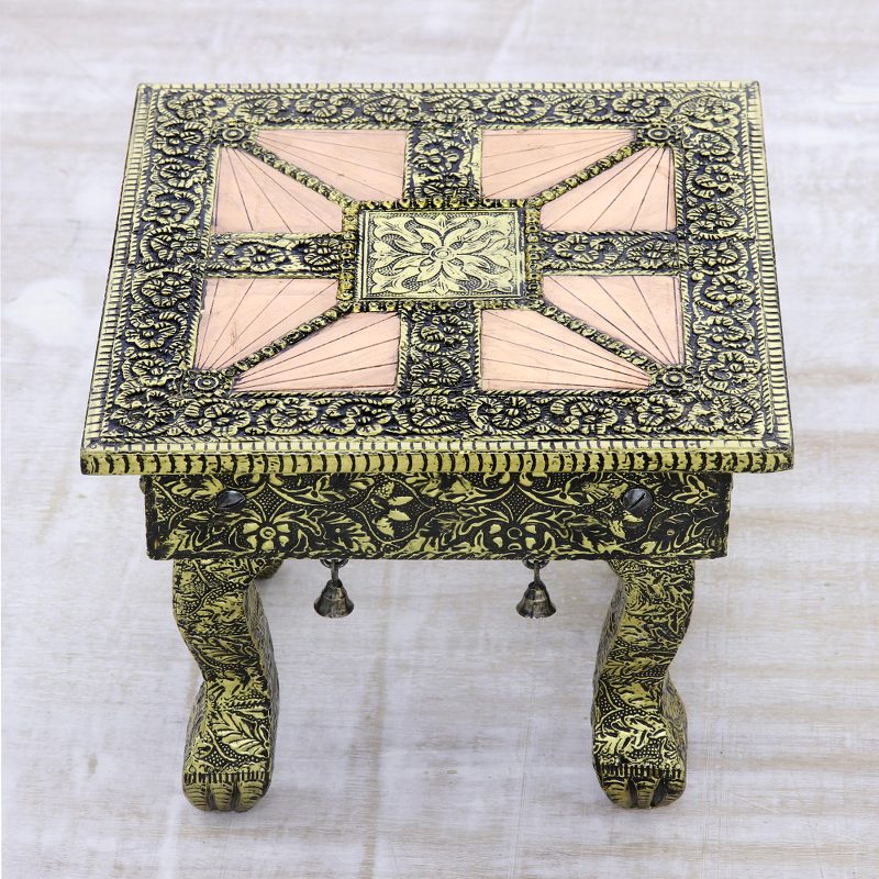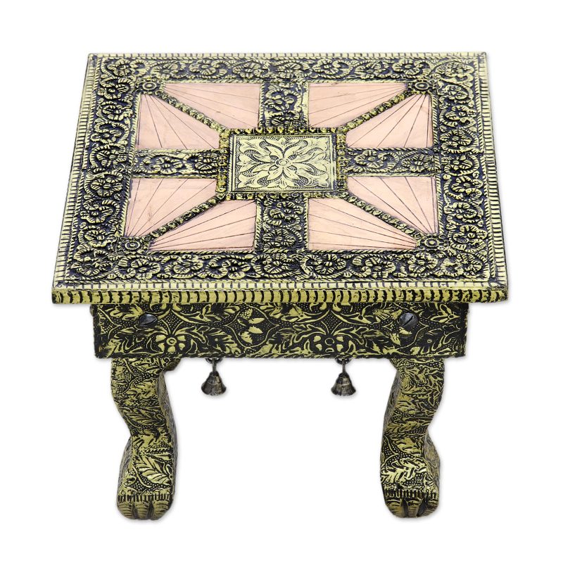 Backed by our 100% Happiness GuaranteeKhalid Ali recreates images of Mughal splendor on a decorative stool. Crafted of mango wood, it is covered with gleaming repoussé. Copper provides a smooth contrast to nickel plated brass in a very original decorator piece.