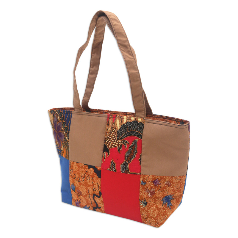 Batik motifs adorn a patchwork pattern in a sweet palette of brown tones. Wahyu Sulistiani's handbag is crafted in Java from cotton, adding a sturdy handle and a zippered closure. The accessory is also lined and has an interior pocket for small items, making it a handy complement with a lovely aura.