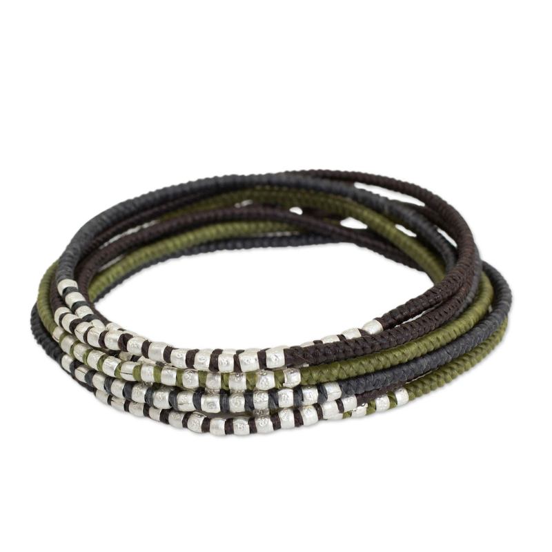 Thailand's Napapat designs a trendy wrap bracelet in shades of brown, gray and olive. She unites three strands into the loop and clasp, knotting them by hand into strands long enough to wrap around the wrist. Florid beads of sterling silver plated brass contrast with feminine elegance. They are crafted by Karen hill tribe artisans.