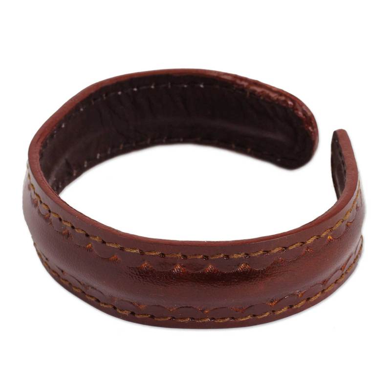 Backed by our 100% Happiness GuaranteeMyriad suns subtly frame the design of this handsome cuff bracelet by Chaloemphon from Thailand. Designed for men, the bracelet is crafted by hand with quality leather featuring dyed patterns in dark brown. The underside is black and the stainless steel wire inside allows you to adjust the cuff as desired.