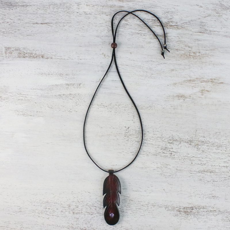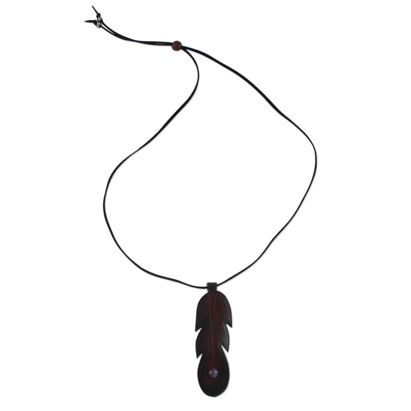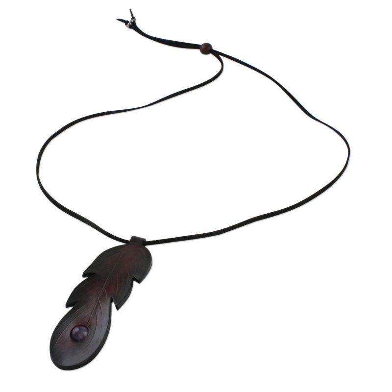 Combining the striking contrast of leather and amethyst, Thailand's Chaloemphon presents an attractive necklace. Genuine leather takes a feather shape to host the violet cabochon gem. The completed pendant hangs from an adjustable faux suede cord that culminates in bone beads.