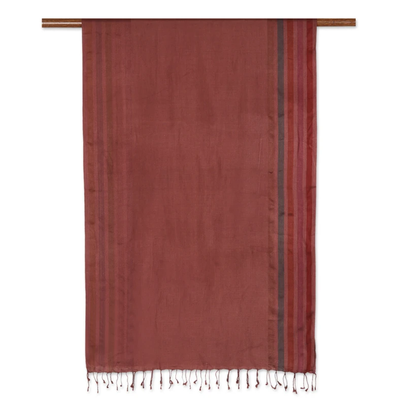 Backed by our Happiness GuaranteeStripes in red, purple, rust, green, grey and taupe grace the sides of this marvelous brown shawl presented by Khitish. Hand-woven from 100% silk on a traditional loom in India, the beautiful shawl is a must-have for its versatility and style.