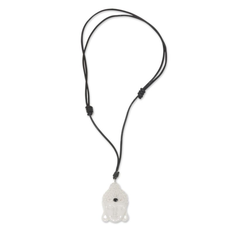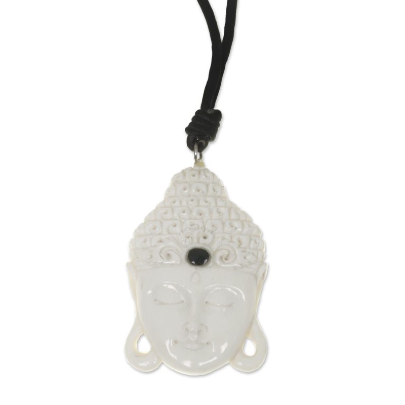 This exquisitely detailed pendant necklace is from Made Wardika in Bali. The Buddha head pendant is carved by hand from smooth cow bone with a bull horn urna, the "eye of wisdom", on the forehead. The pendant centers a dark brown leather cord of adjustable length.