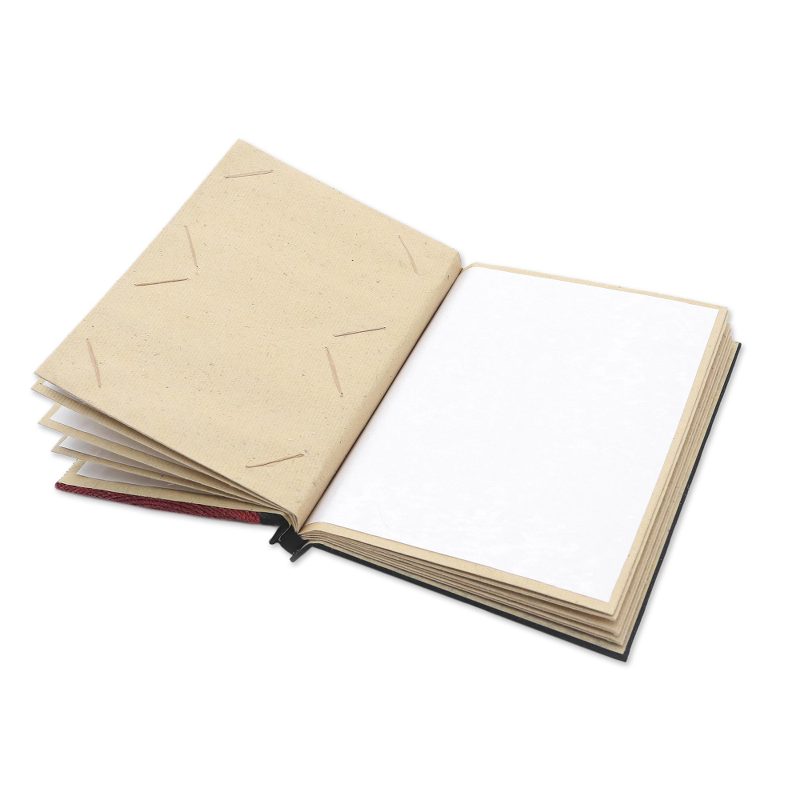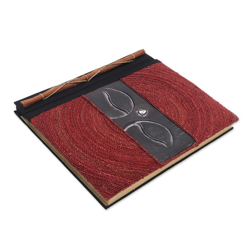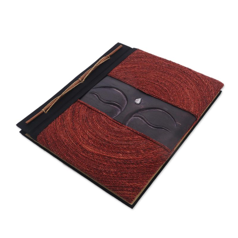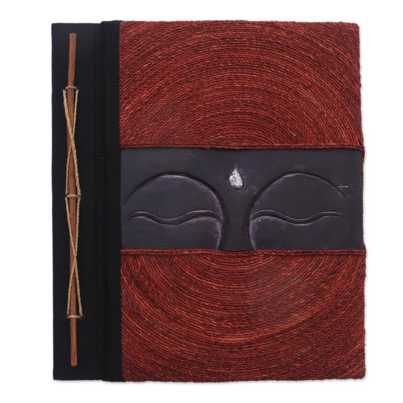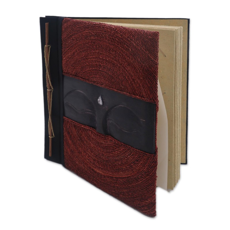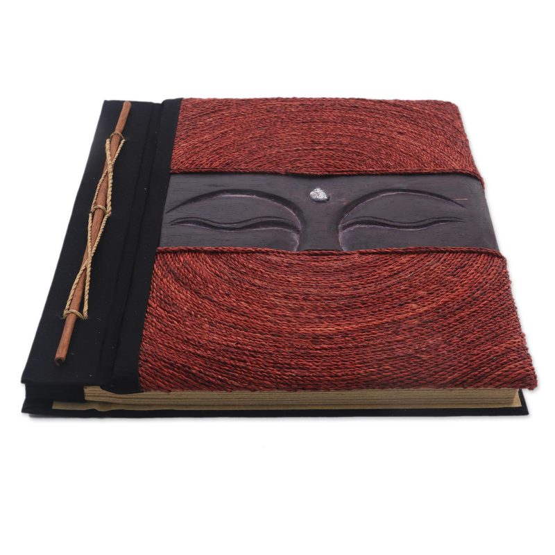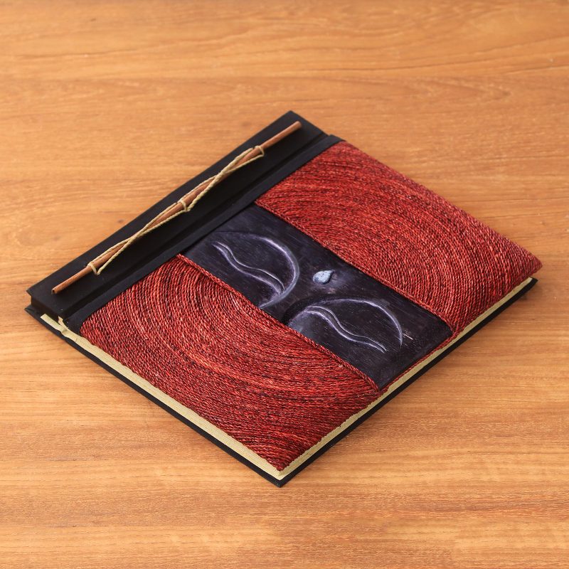 Flanked by red agel grass that creates a concentric pattern, the serene eyes of Buddha are hand-carved of albesia wood and given a dark brown finish. Balinese artisan Komang Sulaksana designs this evocative photo album, which is accented with a cinnamon stick and black fabric. The photo album opens to 20 pages of handmade rice straw paper for storing your precious memories. Each page fits two photographs.