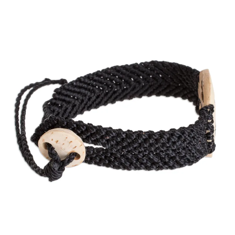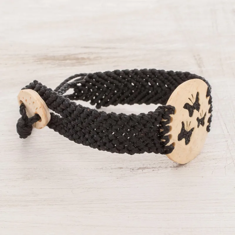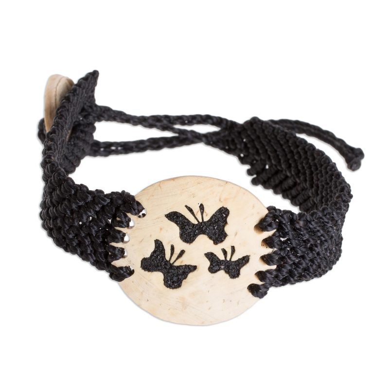 Hand-carved from a disc of coconut shell, three beautiful butterflies decorate the pendant of this bracelet from Guatemala. Artisans Fernando and David fill the cutout section with lava stone and resin for a beautiful contrast. The pendant centers an adjustable macrame wristband.