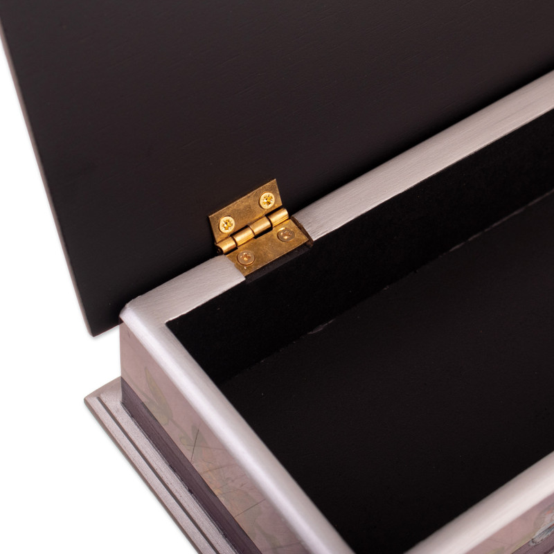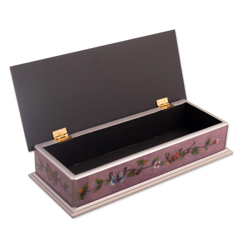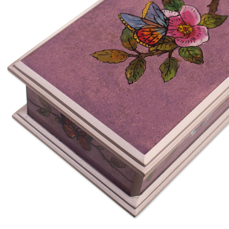 Flowers and butterflies are a sublime combination in any artwork as they symbolize passion and transformation. Drawing inspiration from these gifts of nature, Peruviana artisan Flora Polo handcrafts a decorative wood box in a purple tone. Using the traditional reverse-painted glass technique, Flora adds blooms and butterflies to the design, making a wonderful creation.