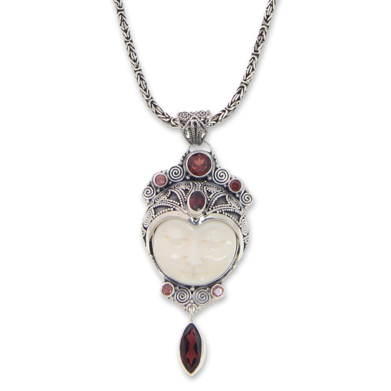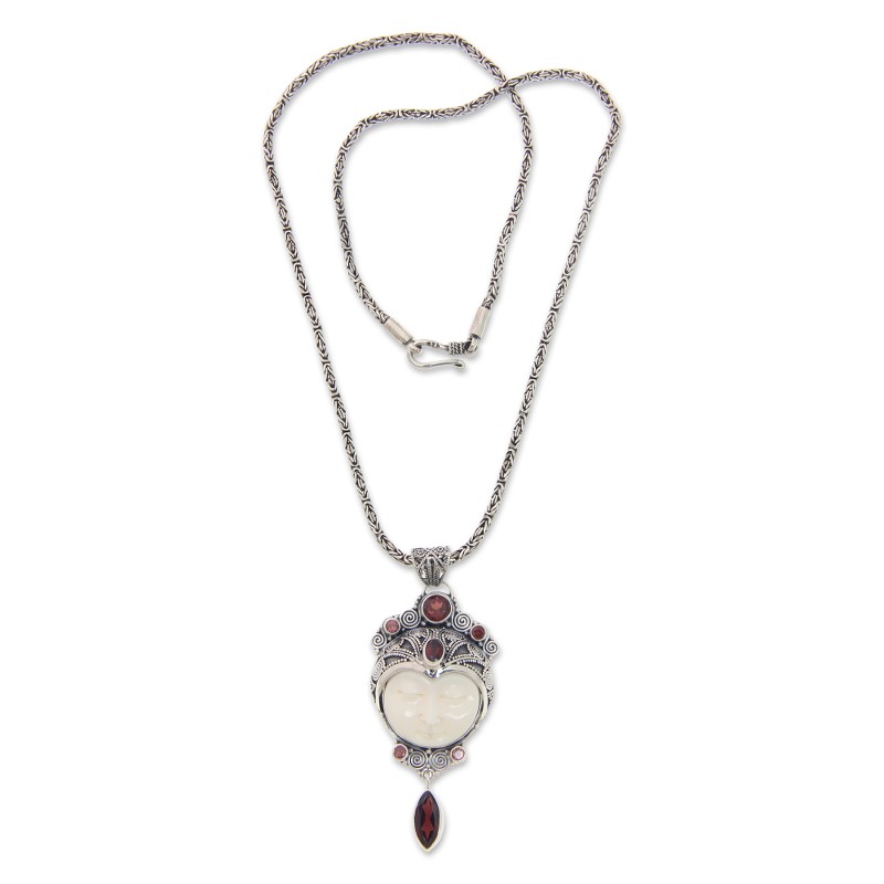 Backed by our 100% Happiness GuaranteePretty Layonsari sleeps peacefully, dreaming of one day being reunited with her lover, Jayaprana. Artisan Komang Suastra names this pendant necklace for the heroine in a Balinese tale of star-crossed lovers, who are finally reunited only in death. The hand-carved bone pendant is lavished with faceted garnets and crowned with silver. It is suspended from a classic Borobudur chain.