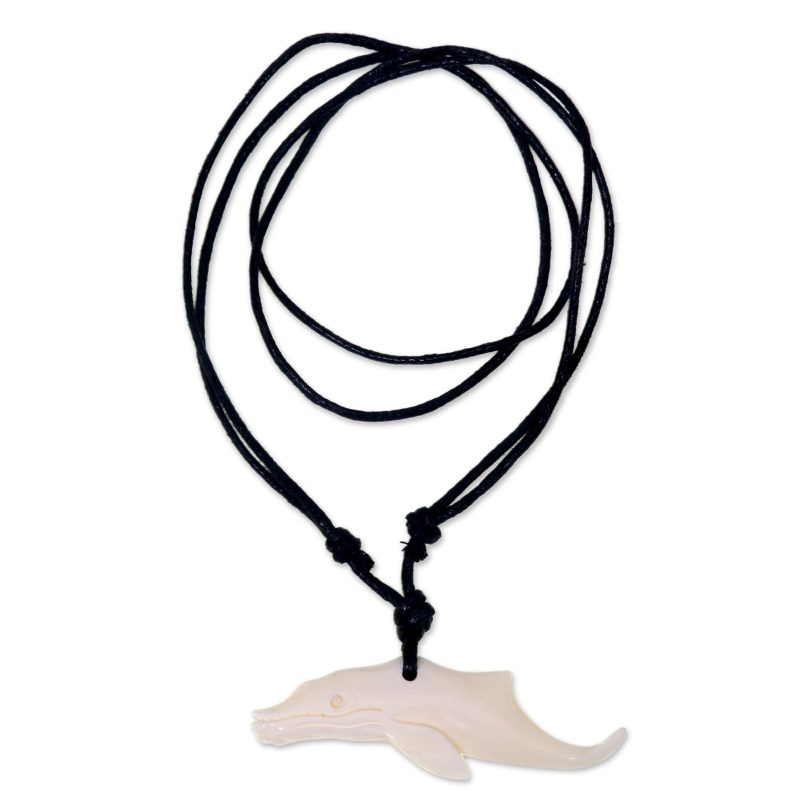 This handsome whale pendant is detailed with expert artistry in a necklace from Bali. The bone pendant is carved by hand and set at the center of a black cotton cord necklace of adjustable length. The whale is associated with emotion, inner truth and creativity.