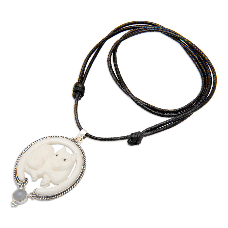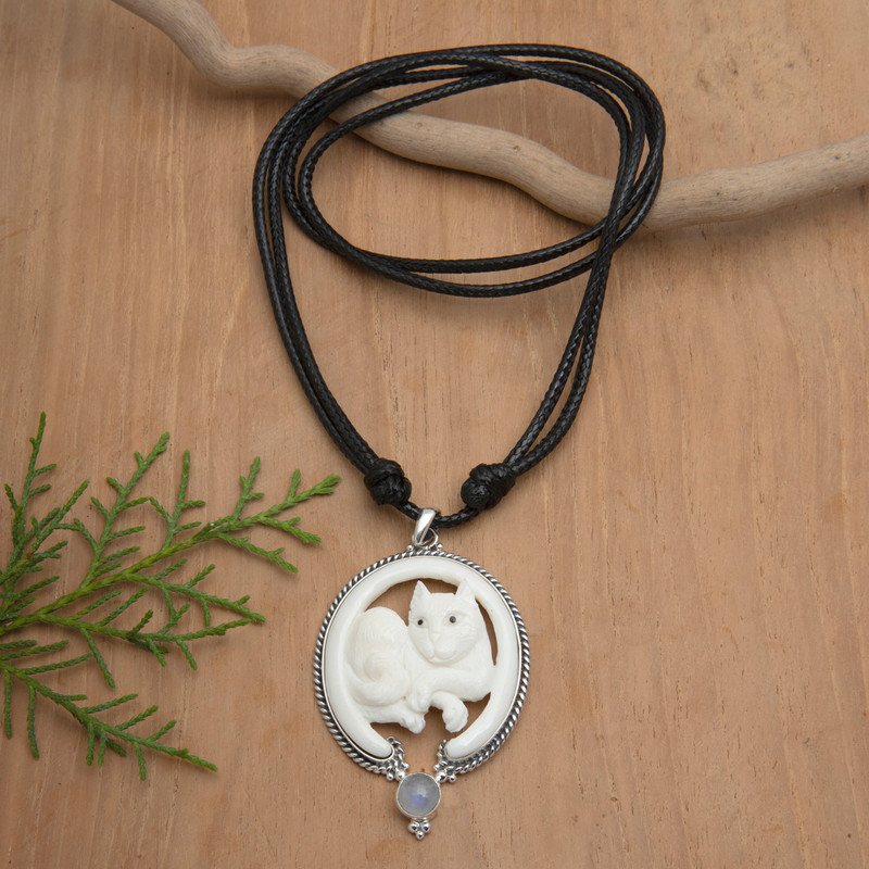 A comfortable black cotton cord with an adjustable length allows you to wear an exquisite design directly from the prosperous Balinese lands. Ayu Ary's necklace features a bone pendant portraying a little kitten, enhanced by a polished sterling silver structure. The feline, a symbol of intelligence, precedes a dangling natural rainbow moonstone, representing harmony.