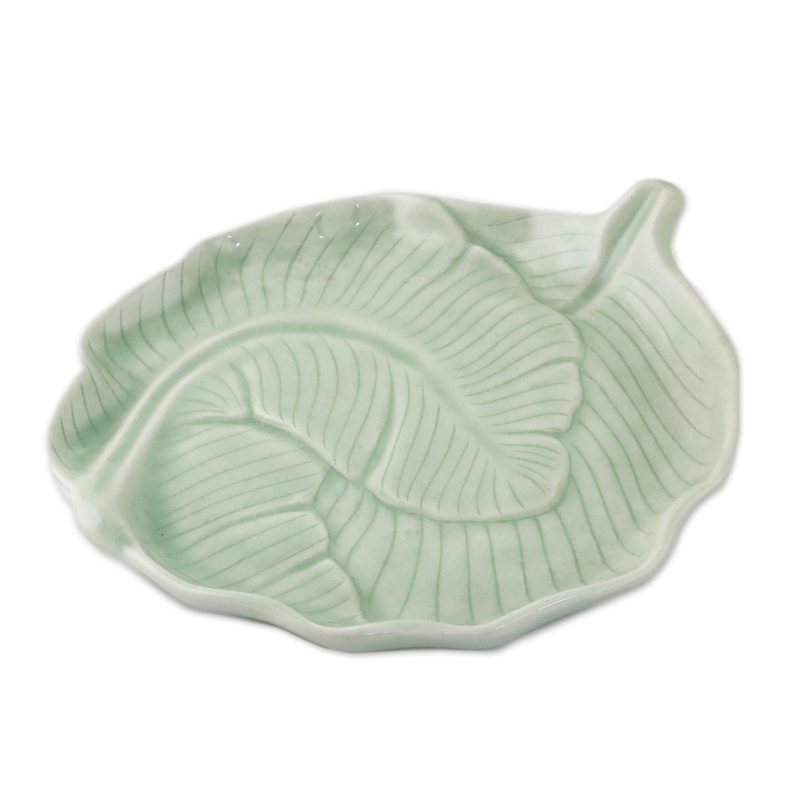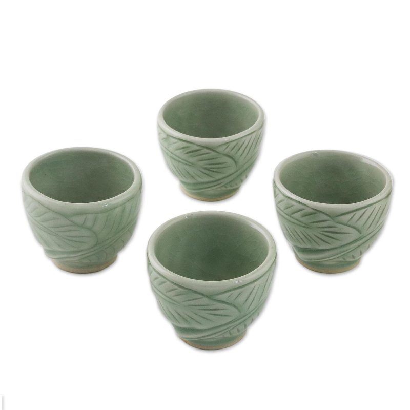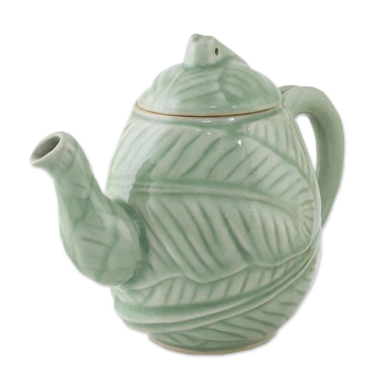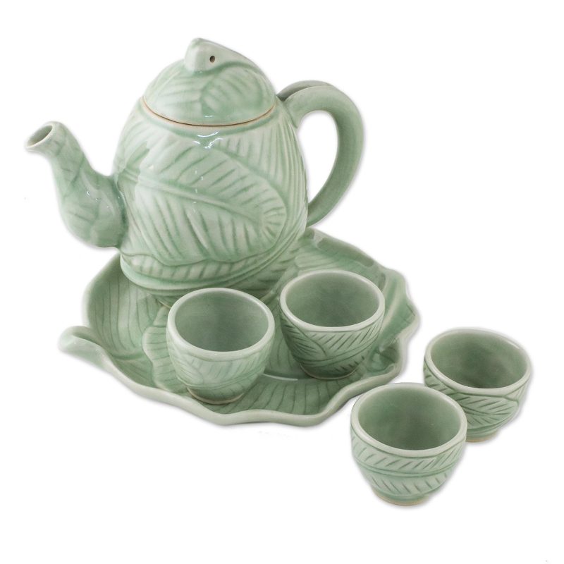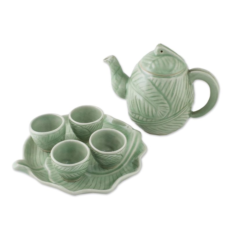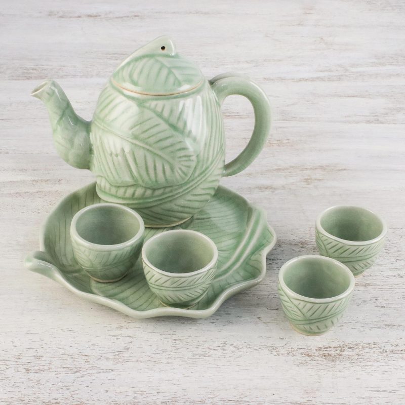Banana leaves shade an enchanted island with their cool jade shadows. Exploring the colors of nature, Kanda creates a sleek tea set. The teapot is presented with four cups on a matching tray that doubles as a serving plate. Celadon ceramic lends its cool allure and crackled fascination to the set.