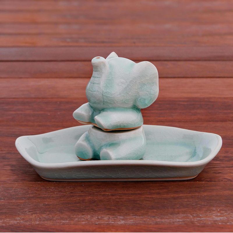 Backed by our 100% Happiness GuaranteeWorking in the traditional art of celadon ceramic, Penpan in Thailand creates this wonderful salt and pepper set. The elephant's head is the salt shaker, while the elephant's body dispenses pepper. The salt and pepper set arrives on a ceramic tray, and all three pieces feature celadon's characteristic crackled glaze in a pretty aqua shade.