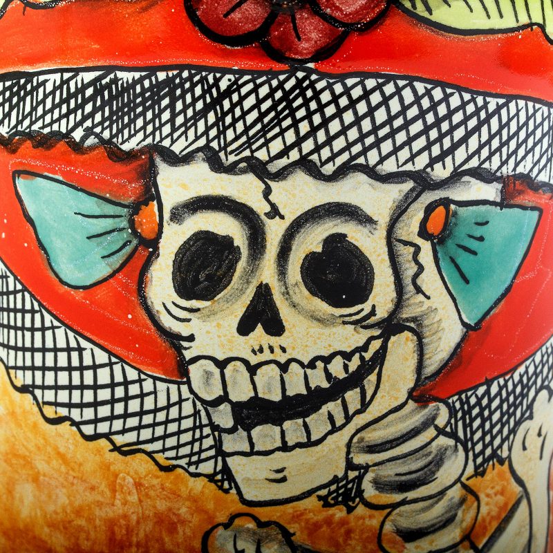 This ceramic vase is crafted in the traditional majolica style and painted by hand with a stunning catrina. The elegant lady is rendered in brilliant colors by the Contreras Family.