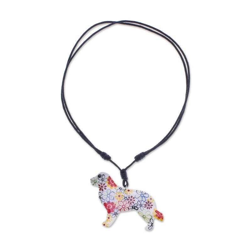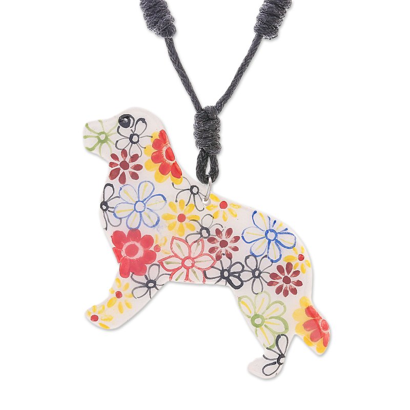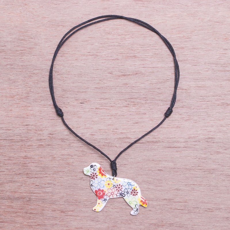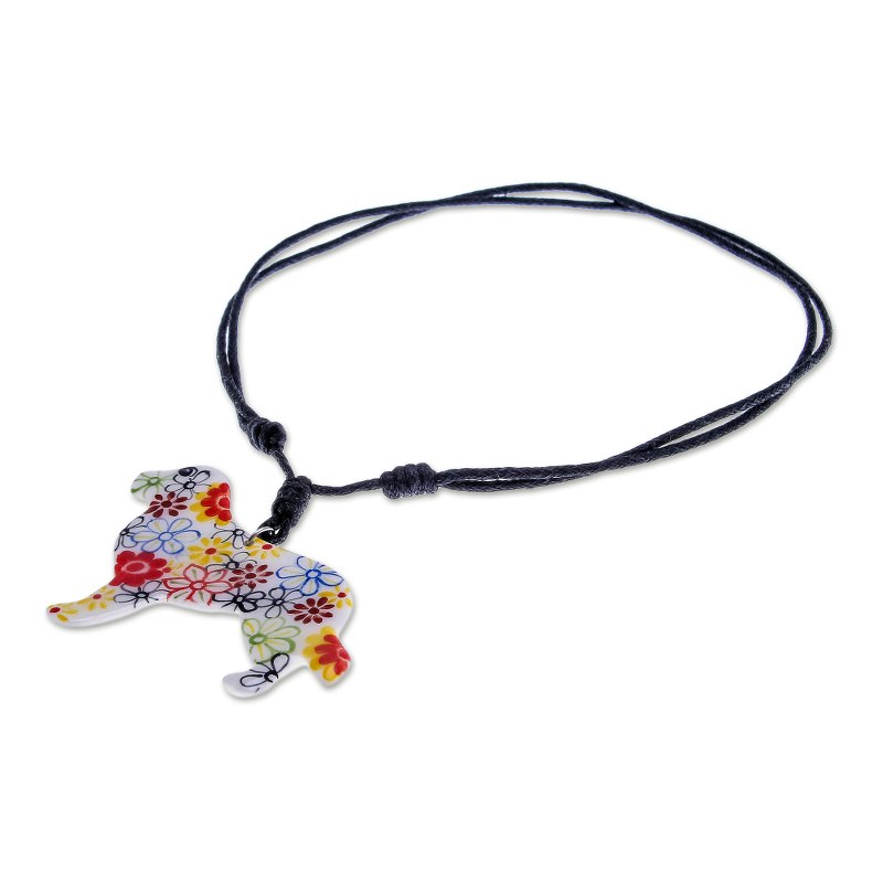 Paying homage to humankind's best friend, Thai artisan Napat Chotpruekchookul creates a pendant necklace of floral beauty. Cotton cord, adjusting with a sliding knot, encircles the neck. The cord is centered by a ceramic pendant in the shape of a dog, its white surface painted by hand with colorful floral motifs.