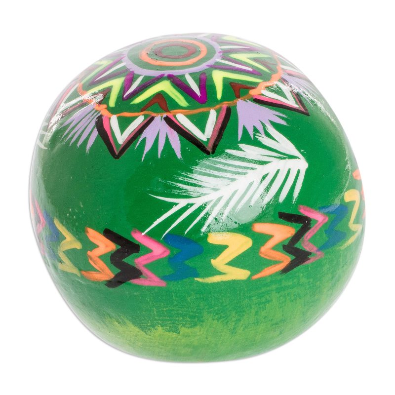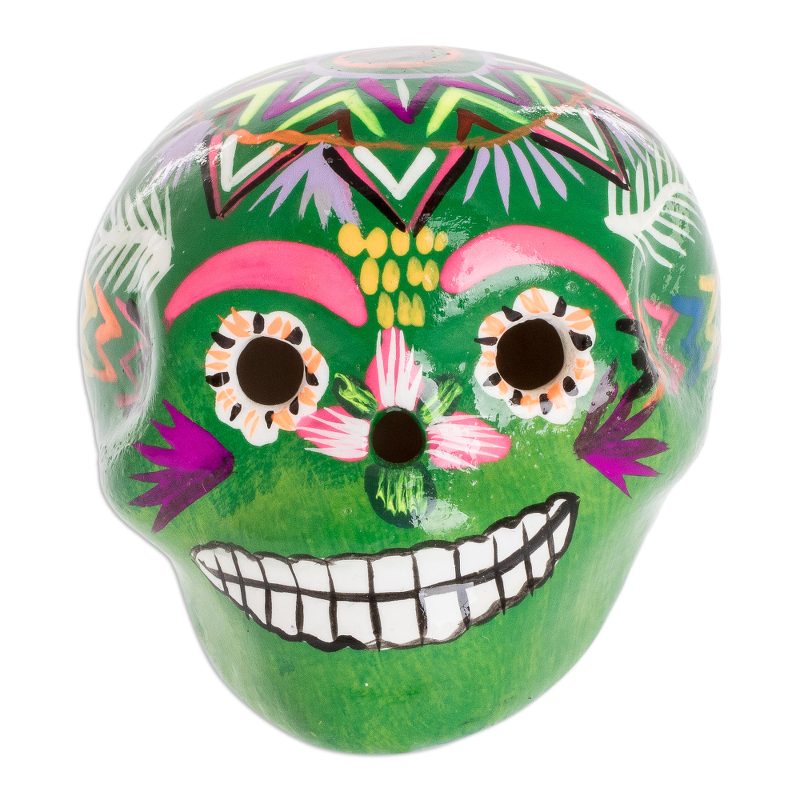 This fun figurine is from Vitelio Orozco in Guatemala. The small skull is formed from ceramic and carefully hand-painted with colorful motifs on a green background.