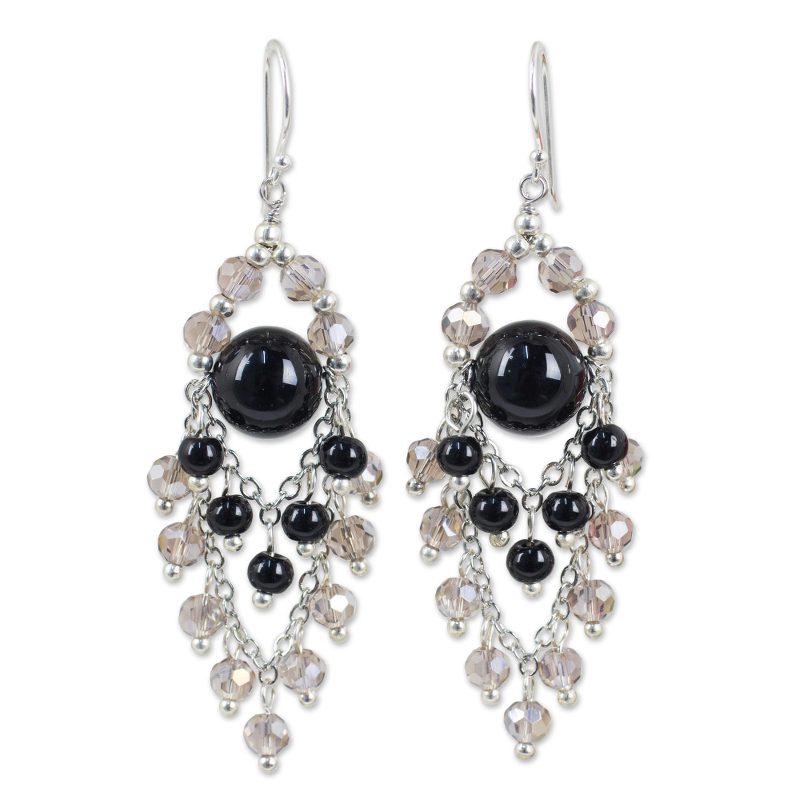 Blazing a brilliant trail, these earrings from Nareerat in Thailand make a sparkling fashion statement. Globes of onyx are set within tiers of silver chain that suspend sparkling glass beads and additional onyx beads. Silver plated beads add their polished gleam to the effect. The earrings sway from sterling silver hooks.