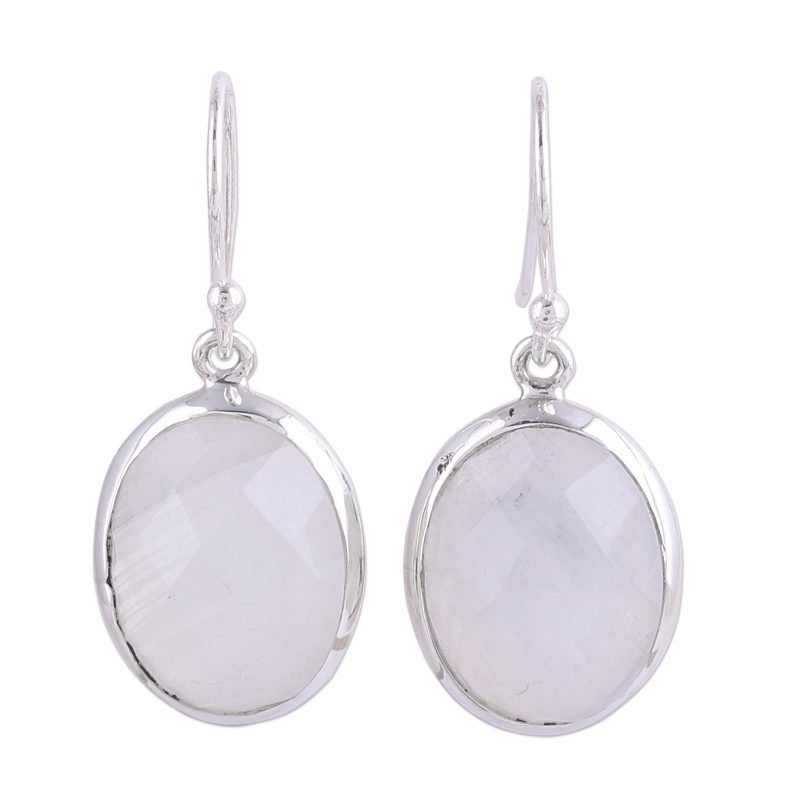 Backed by our 100% Happiness GuaranteeCaptivating rainbow moonstone shimmers mysteriously in these earrings from Shanker in India. The gems are give a checkerboard facet to catch the light, and set in polished sterling silver bezels. The classic oval dangle earrings swing from sterling silver hooks.