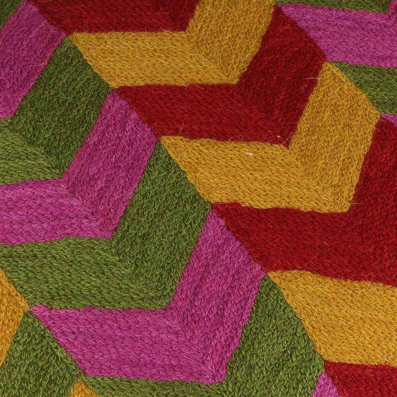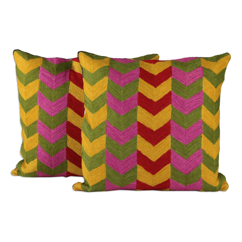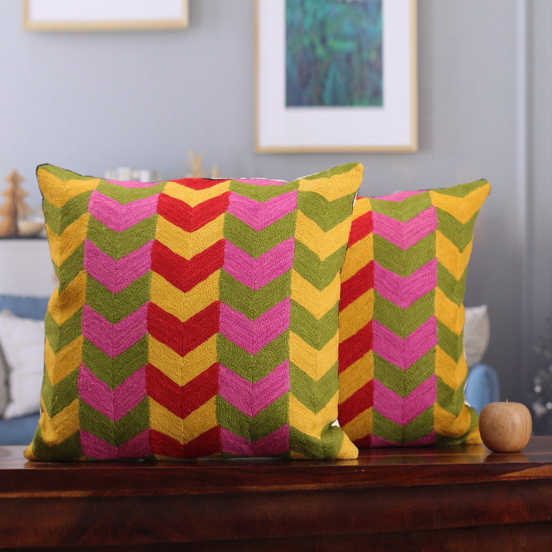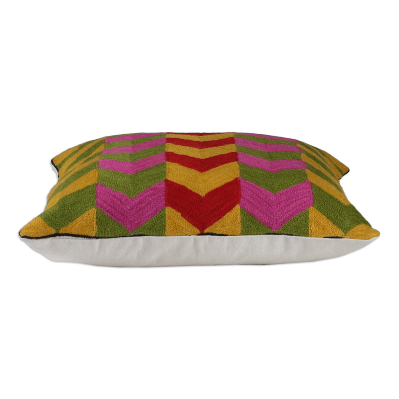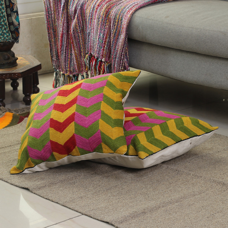 Inspired by the minimalist chevron pattern, this pair of cotton cushion covers by India's Saqib Khan is here to add a bold and vibrant touch to your spaces. Intense green, pink, red and yellow hues unite in geometric details, crafted from embroidery techniques and acrylic yarns.