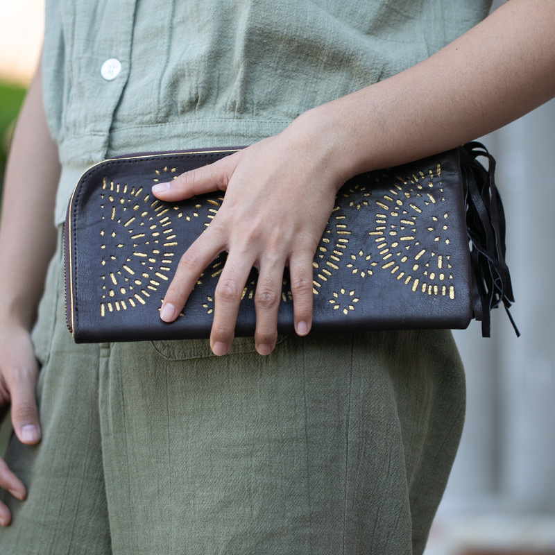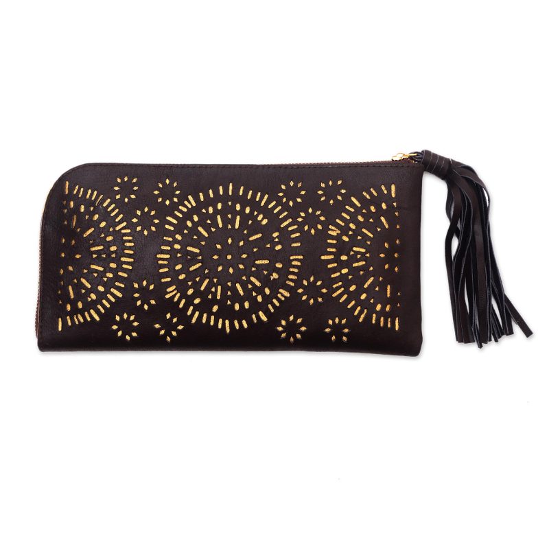 Decorated with openwork circular patterns that reveal a golden hue underneath, this blissfully beautiful clutch is handcrafted from espresso leather. Created by Balinese artisan Tuniyaton, this clutch opens with a tasseled zipper, revealing a faux suede-lined interior that is complete with 12 card slots, a zipper pocket, and two slots for paper bills. This bag is named Matahari, which means "sun" in Indonesian.