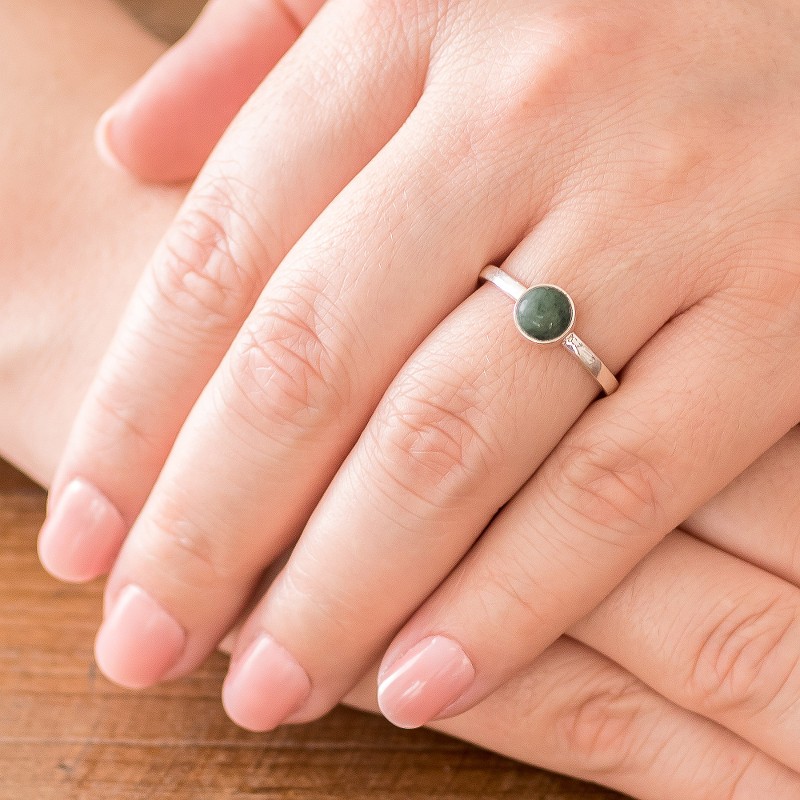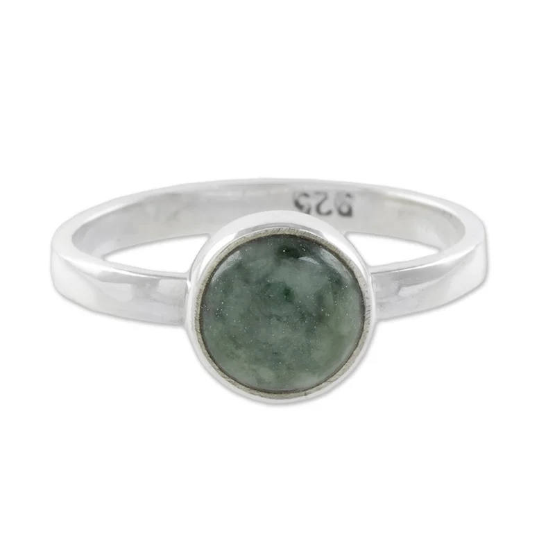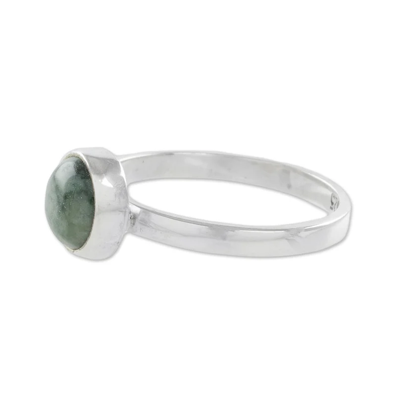 Backed by our 100% Happiness GuaranteeFeaturing a round cabochon of natural green Guatemalan jade, this beautiful single-stone ring from Guatemala features a design by Zandra Lorena Sajbin. She crafts the band of sterling silver, circling the finger with a high-polish elegance.