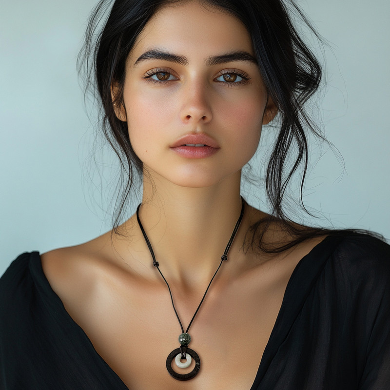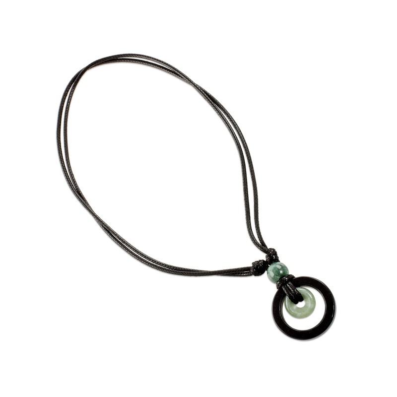 Delivery EstimateAdorning the neck on a length of adjustable cotton cord, this striking necklace from Guatemala is the perfect accessory for men and women. Ruben and Gilda Perez carve a ring of black jade, centered by a light green disc at the center and accentuated by a green bead just above.