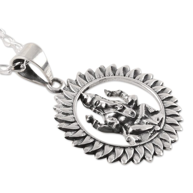 Backed by our 100% Happiness GuaranteeFramed within a corona of flower petals, the mighty elephant-headed Hindu god Ganesha, known as "remover of obstacles," is depicted in the pendant of this necklace from India. Arunima presents this necklace, crafted from sterling silver with a combination of finishes. Ganesha is depicted with weapons in two of his hands and a symbol of peace and his favorite dessert in his others.