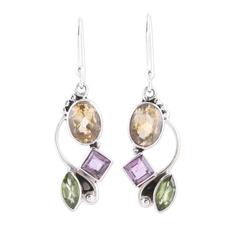 A faceted oval citrine gemstone hovers like a shining sun over a stylized violet flower in these earrings, made of a faceted square of amethyst for the bloom and a marquise-cut peridot for the leaf. The gemstones are connected by graceful arcs of sterling silver. Neeru Goel of India presents this beautiful pair of dangle earrings.