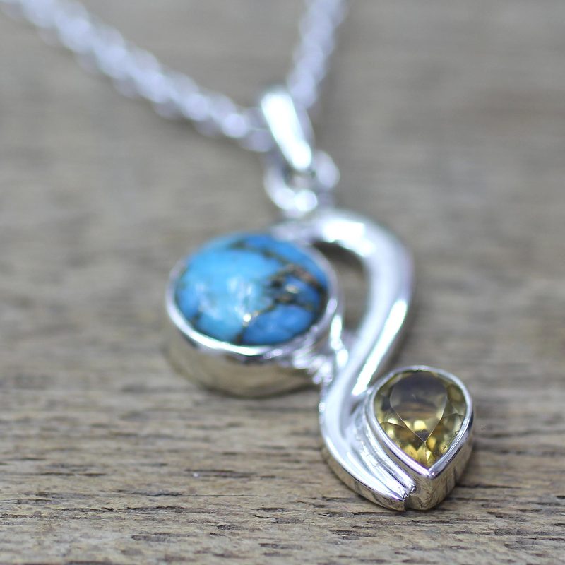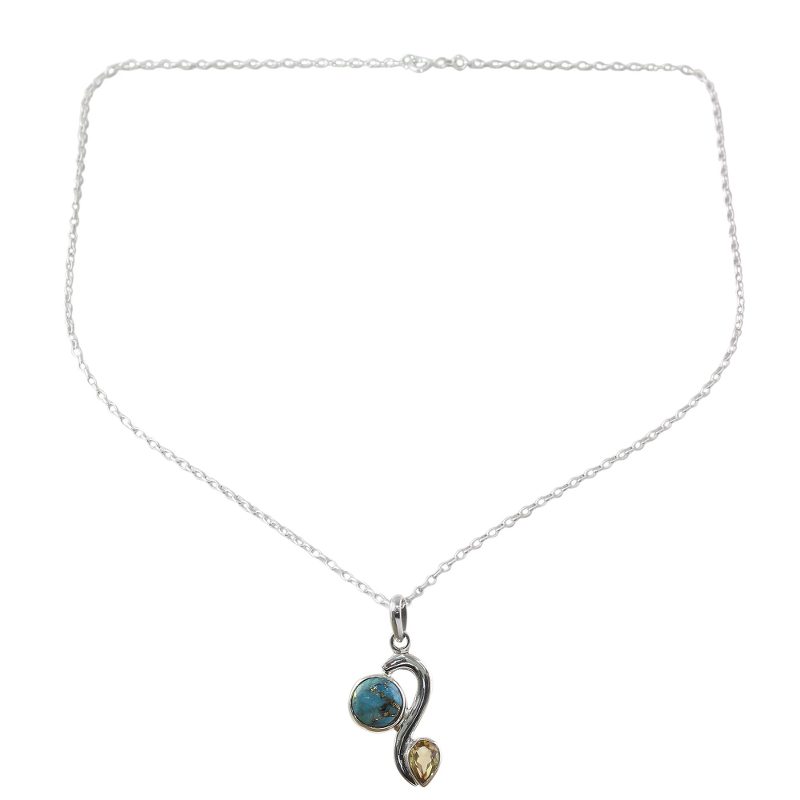 Backed by our 100% Happiness GuaranteeA round stone of composite turquoise sparkles with golden veins across its blue surface, like a brilliant planet. It is accompanied by a teardrop-shaped stone of citrine weighing over one carat in the pendant of this elegant necklace. Presented by Shanker, this Indian necklace features handcrafted wave motifs in sterling silver created by local artisans.