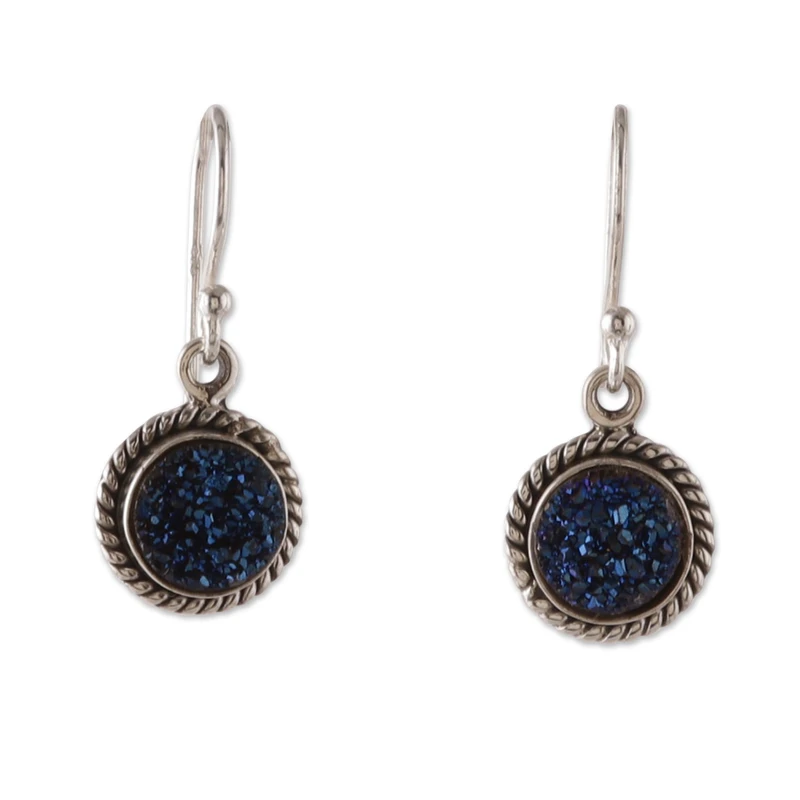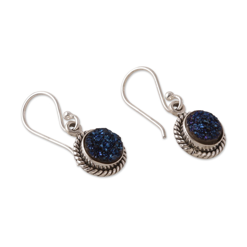 Backed by our 100% Happiness GuaranteeThe drusy quartz jewels decorating Bhavesh's dangle earrings sparkle with a shade of intuition. Local Indian artisans craft these sterling silver earrings with traditional techniques, enriching the stones' blue hues with a combination of polished and oxidized finishes.