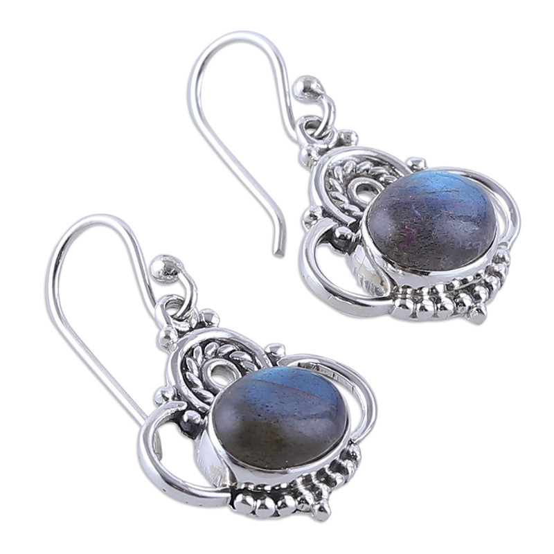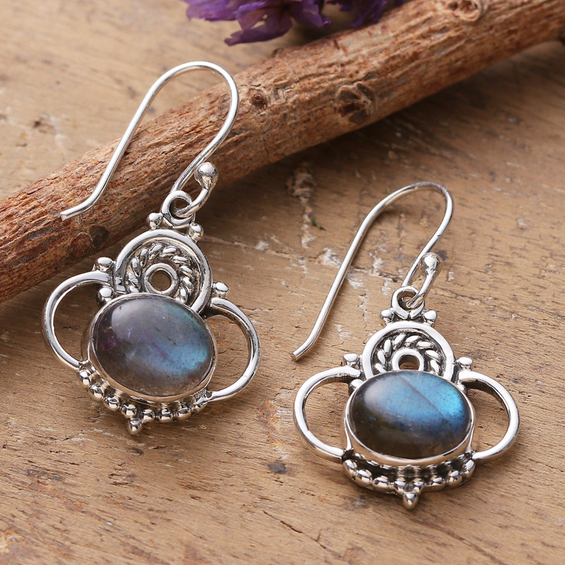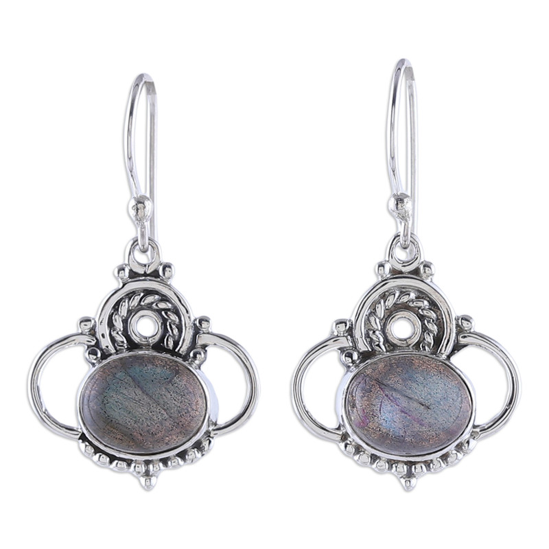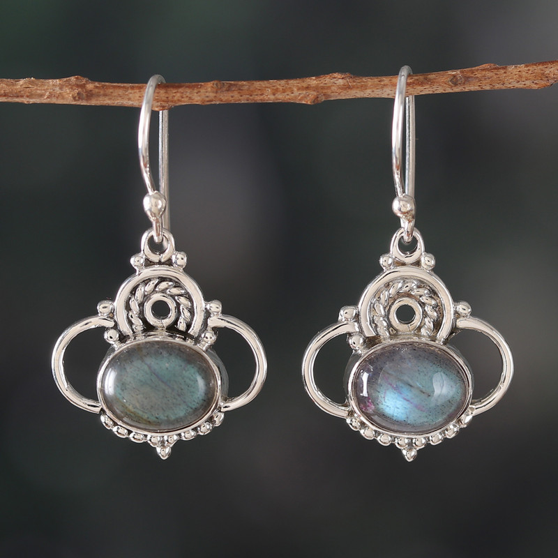 Backed by our 100% Happiness GuaranteeStunning hues and elegance characterize these dangle earrings, presented by Neeru Goel of India. Master artisans work with sterling silver to craft these classic pieces, whose elements surround natural labradorite stones in a display of beauty and mysticism.