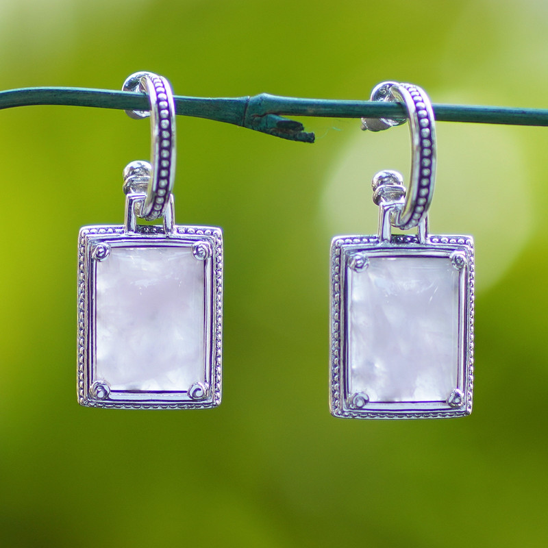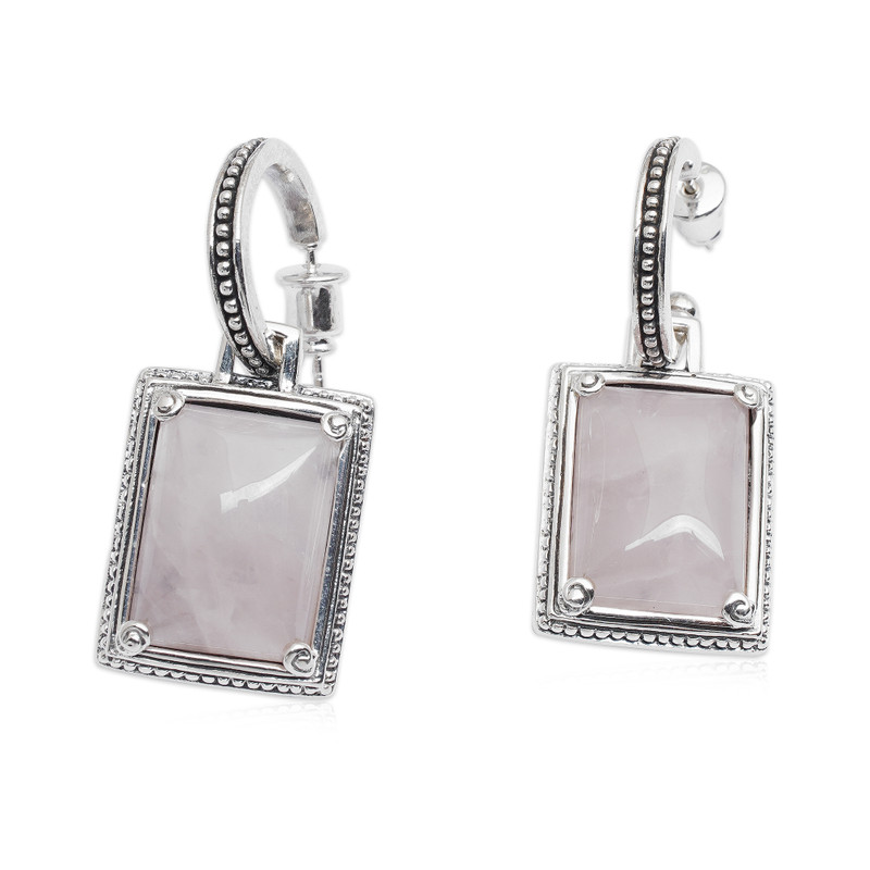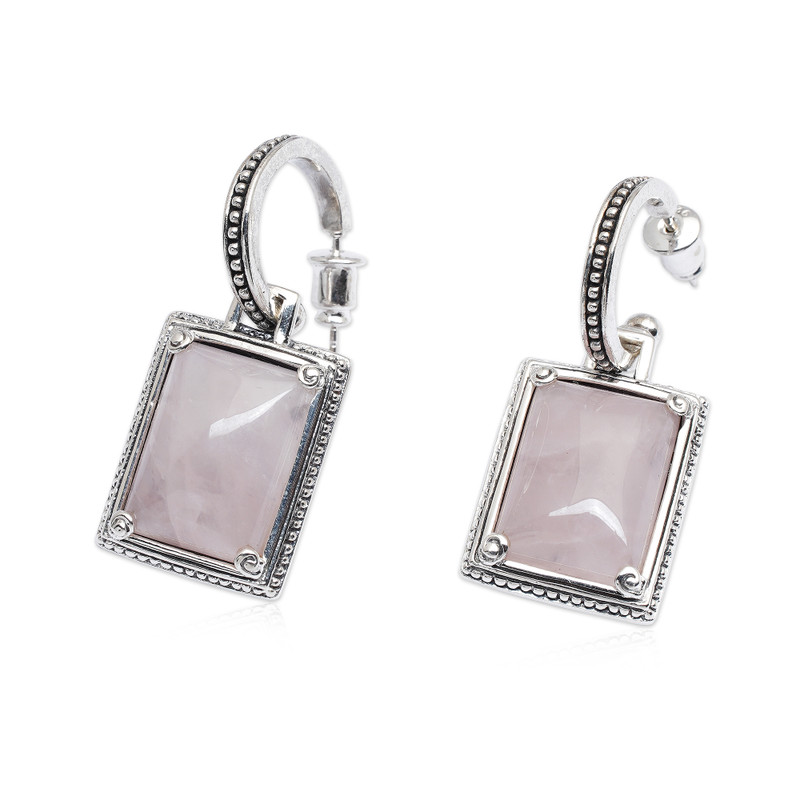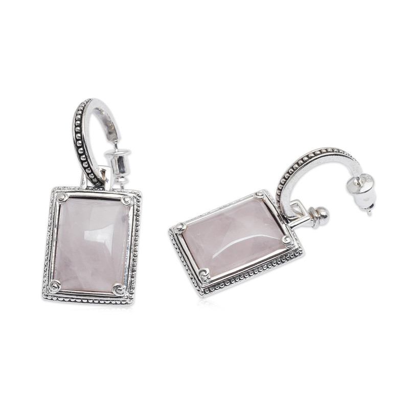 Evoking an era of glamour and majesty, Zayd Makarim's sterling silver dangle earrings paint your days in a tender hue of pink. The pair, accented with classic details and a regal rectangular shape, lets its polished and oxidized finishes shine along sublime rose quartz cabochons—each a symbol of unconditional love.