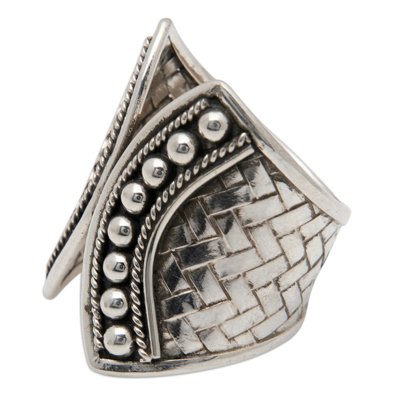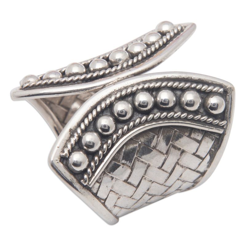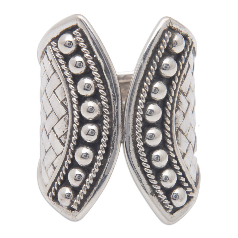 The stunning Balinese region shows its majestic elegance in this sterling silver cocktail ring presented by Komang Wijayana. Made by local artisans and inspired by the region's classic ornaments, the accessory is decorated with a basketweave pattern and beaded motifs, all polished for a radiant look that will complement several ensembles.