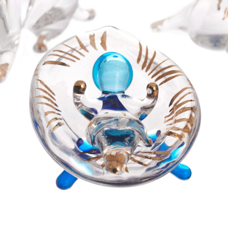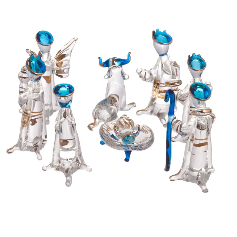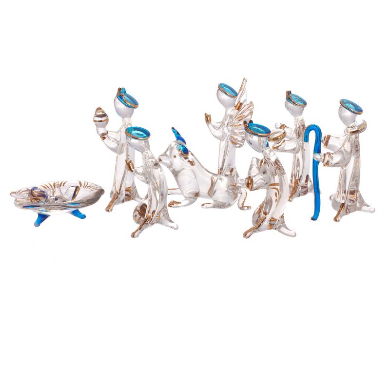 In celebration of Christmas, Peruvian artisan Milton Rios creates this festive nativity scene to add to your home decor. Crafted from clear and light blue glass, this 10-piece set depicts the three wise men, an angel, two farm animals, as well as Joseph and Mary gathered around baby Jesus's cradle. Each figurine is diligently painted by hand with gleaming gilt.